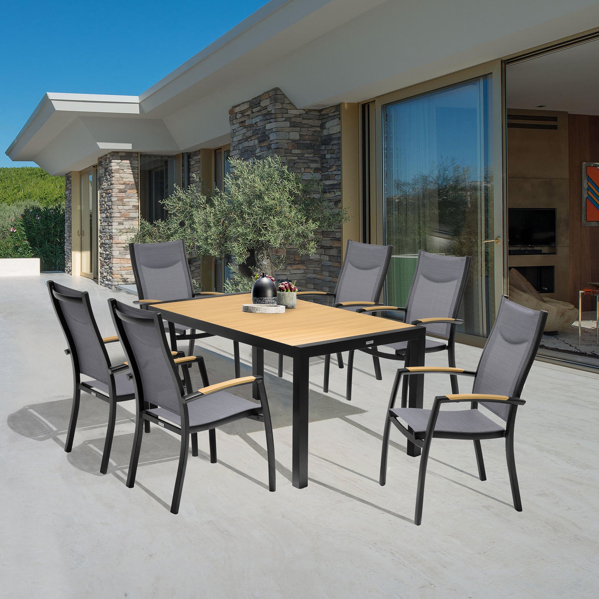 The Panama Outdoor 7 Piece Black Aluminum Dining Set from Armen Living exudes convenience with its many features. Lightweight and durable, the aluminum frame and tabletop are sturdy, strong, and stable - giving you the peace of mind that this table will last you for many years to come. The unique tabletop slats and chair arm accents mimic wood but are a unique finish on the aluminum that gives off a warm and natural finish and lifts the design and details of the table but are easy to clean and naturally environmentally friendly as well as weather resistant. These chairs are also simple to store and can easily stack on each other. The wide tabletop is perfect for entertaining guests at your home! The wonderful dining table is constructed with a soft-looking, but tough high-grade teak wood tabletop that can stand up against inclement weather and repel moisture with ease. The Portals dining chairs are stackable making storage and moving convenient and easy. The seat and back material are constructed from PVC-coated yarn that is perfectly woven together to create the perfect solution for outdoor seating, bringing in high strength and elasticity, providing optimum comfort and durability. The Panama Outdoor 7 Piece Aluminum Dining Set comes complete with 6 Panama Outdoor Aluminum Stacking Dining Chairs and 1 Panama Outdoor Rectangular Aluminum Dining Table.
