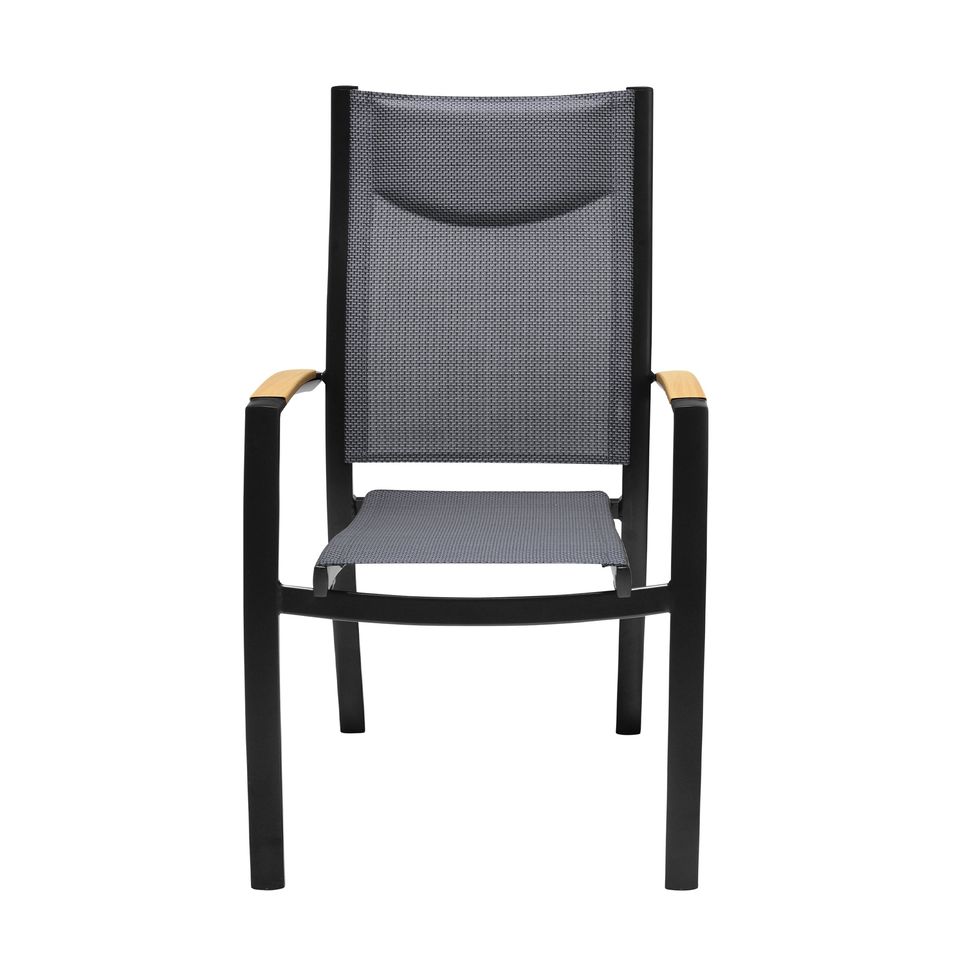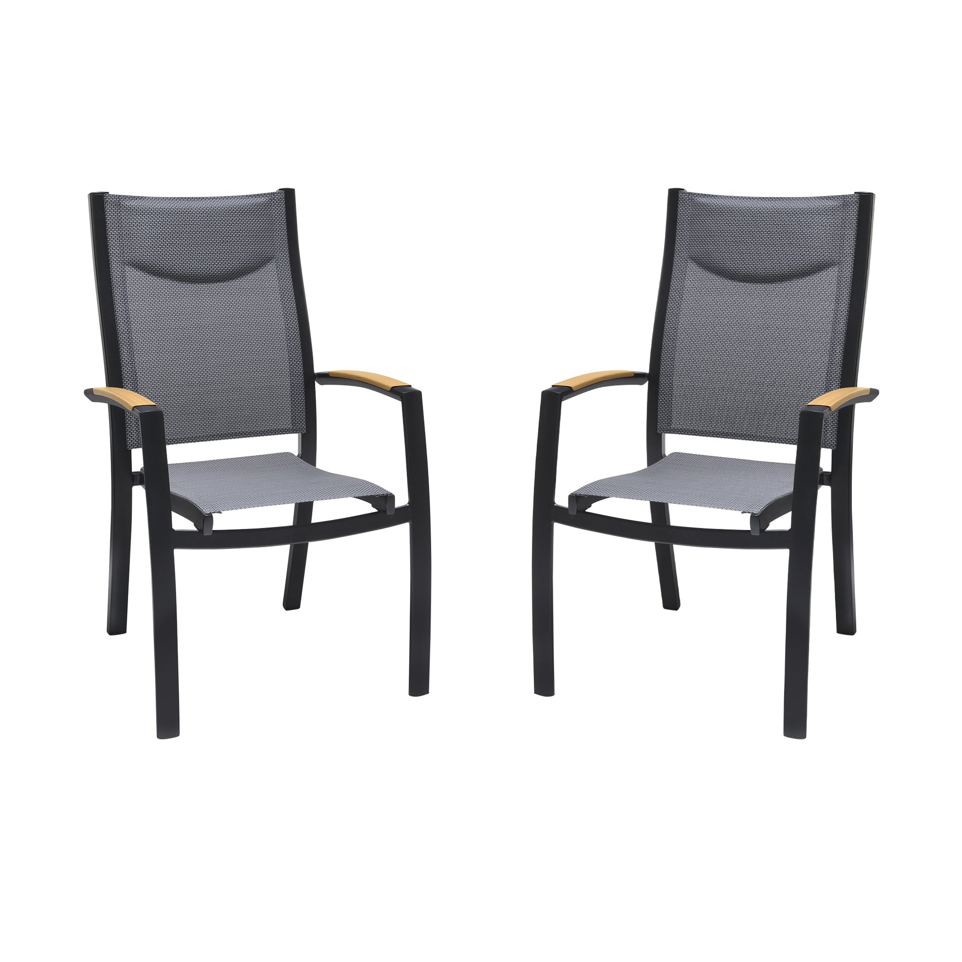 The Panama Outdoor Black Aluminum Stacking Dining Chair - Set of 2 is the best chair for your outdoor area. The strong aluminum frame is perfectly capable of handling wear and tear and any form of weather. The unique arm accents mimic wood but are a unique finish on the aluminum that gives off a warm and natural finish and lifts the design and details of the sofa but are easy to clean and naturally environmentally friendly as well as weather resistant. The seat and back material are constructed from PVC-coated yarn that is perfectly woven together to create the perfect solution for outdoor seating, bringing in high strength and elasticity, providing optimum comfort and durability. The Panama Outdoor Black Aluminum Stacking Dining Chair - Set of 2 is sold as a set of 2 and feature the ability to be stacked, making storage a moving for them easy tasks! Pair the Panama Outdoor Black Aluminum Stacking Dining Chair - Set of 2 with the Panama Outdoor Black Aluminum Rectangular Dining Table for a complete set look! Product Dimensions: W:26 x D:23 x H:39 x SH:17