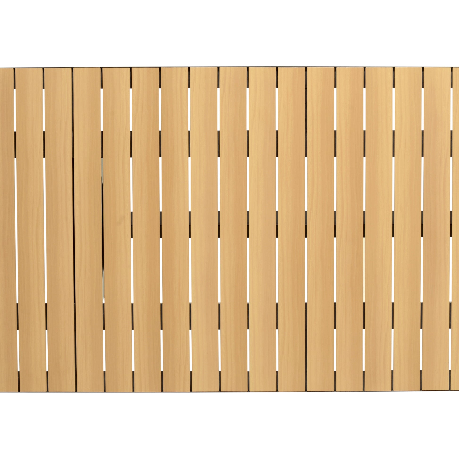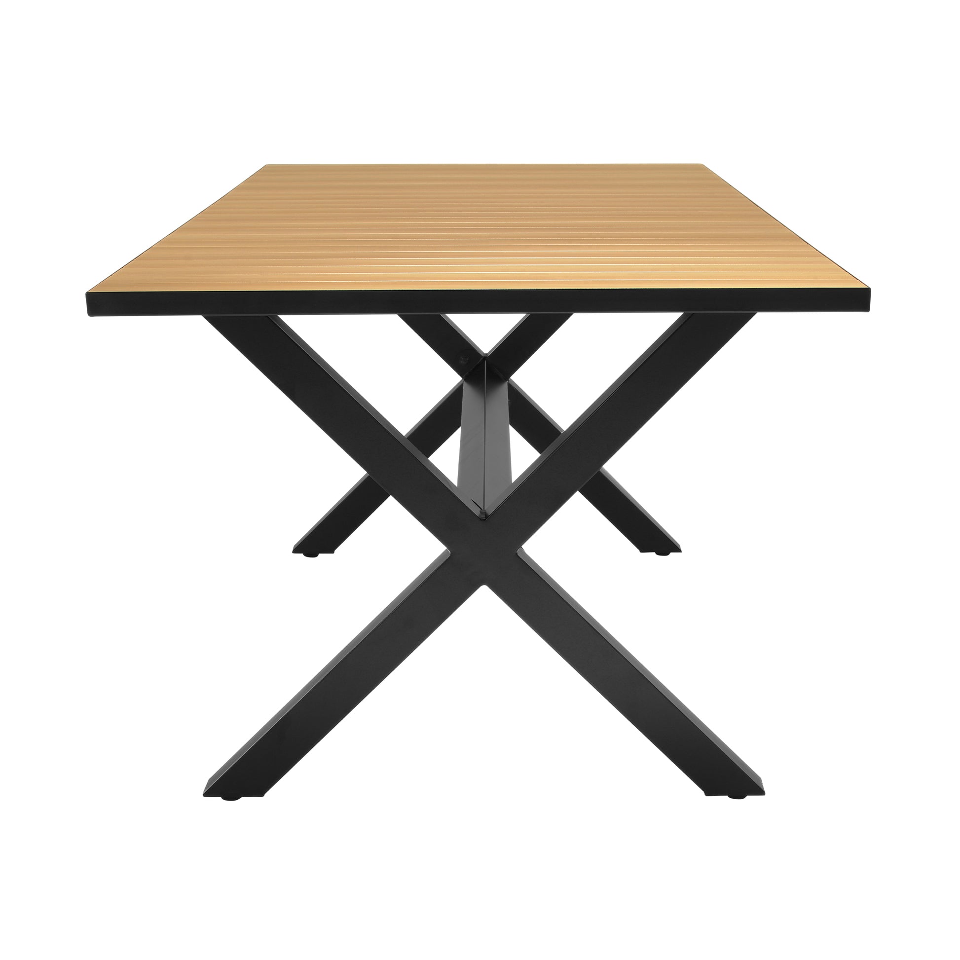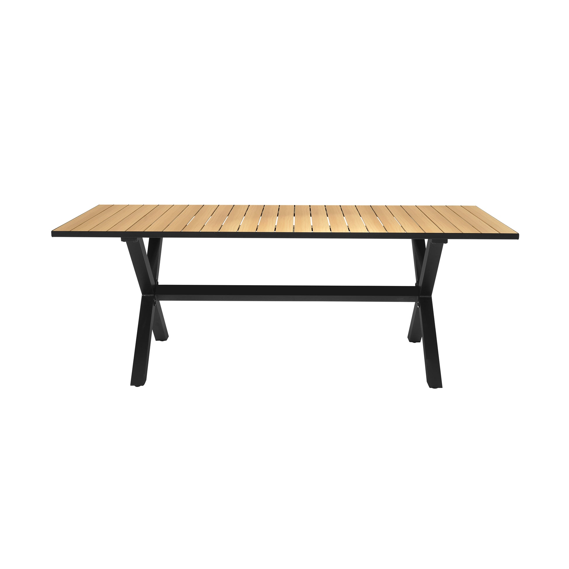Bring in this quintessential piece of outdoor furniture with the Paseo Outdoor Black Aluminum Rectangular Dining Table from Armen Living. The black aluminum frame and tabletop are sturdy, strong, and stable - giving you the peace of mind that this table will last you for many years to come. The unique tabletop slats mimic wood but are a unique finish on the aluminum that gives off a warm and natural finish and lifts the design and details of the table but are easy to clean and naturally environmentally friendly as well as weather resistant. The wide tabletop is perfect for entertaining guests at your home. The cross legs make this a modern version of a traditional picnic table - where you get to mix and match the seating options! Pair this table with any of Armen Living's outdoor dining chairs for an eclectic feel! Product Dimensions: W:79 x D:35 x H:30
