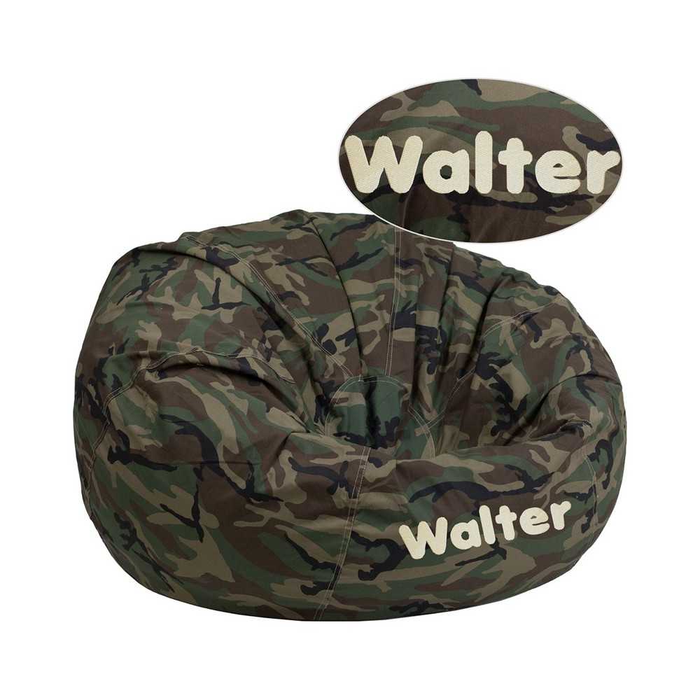 Create a hangout spot in the bedroom, library, craft room, dorm, or family room with this cozy oversized bean bag chair. Personalize it with an embroidered name or other text. Floor chairs are great for any room that can be pulled out at any time to be wallow in. Add flexible seating in the corner of your classroom where students can congregate to socialize or read. Having fun seating in the classroom can create a unique and more enjoyable learning experience. Filled with refillable polyurethane foam beads, this lounge chair easily conforms to your body for an incredible seating experience. A metal safety zipper secures the beads and prevents them from leaking out. The upholstery can be spot cleaned with a damp cloth or remove the slipcover for machine washing when a damp cloth just won't do it. Bean bags are cool chairs for young kids, teenagers and college students due to their casual nature designed for lounging. Pair this large bean bag chair with our small version for a footrest to make your perfect lounge setting. Not only comfortable for relaxing, their lightweight design makes them portable and versatile. [DG-BEAN-LARGE-CAMO-TXTEMB-GG]