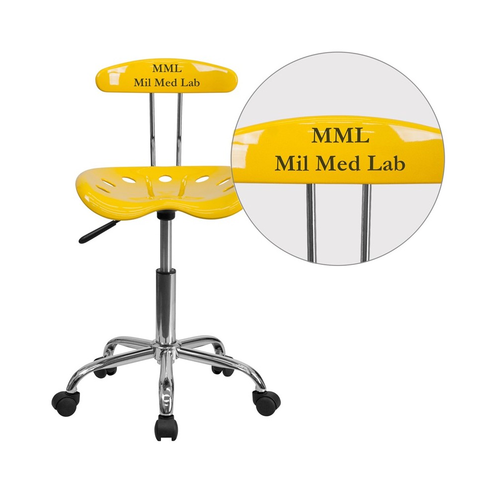 Change up the look in your home office with this colorful vibrant yellow task chair. The molded tractor seat offers a tremendous amount of comfort and can be cleaned with a solvent and water based cleaner such as foam. Chair rotates 360 degrees to provide easy access to a greater range of area. The pneumatic adjustment lever will allow you to easily adjust the seat to your desired height. Dual wheel casters provide ease of movement around the space. The small frame of this chair will not take up a lot of space if working in a small area. Personalize this chair with durable UV resistant vinyl lettering. [LF-214-YELLOW-TXTEMB-VYL-GG]