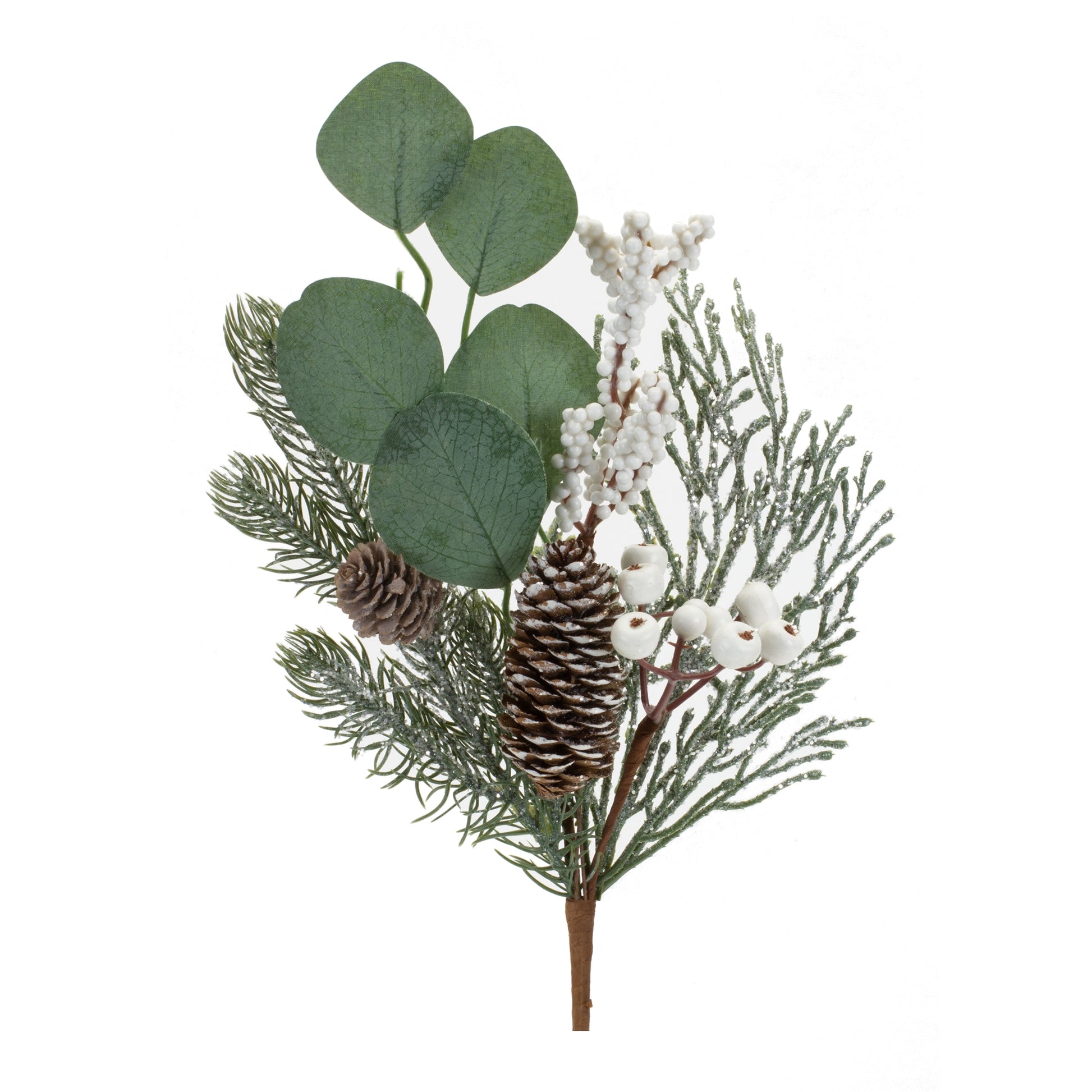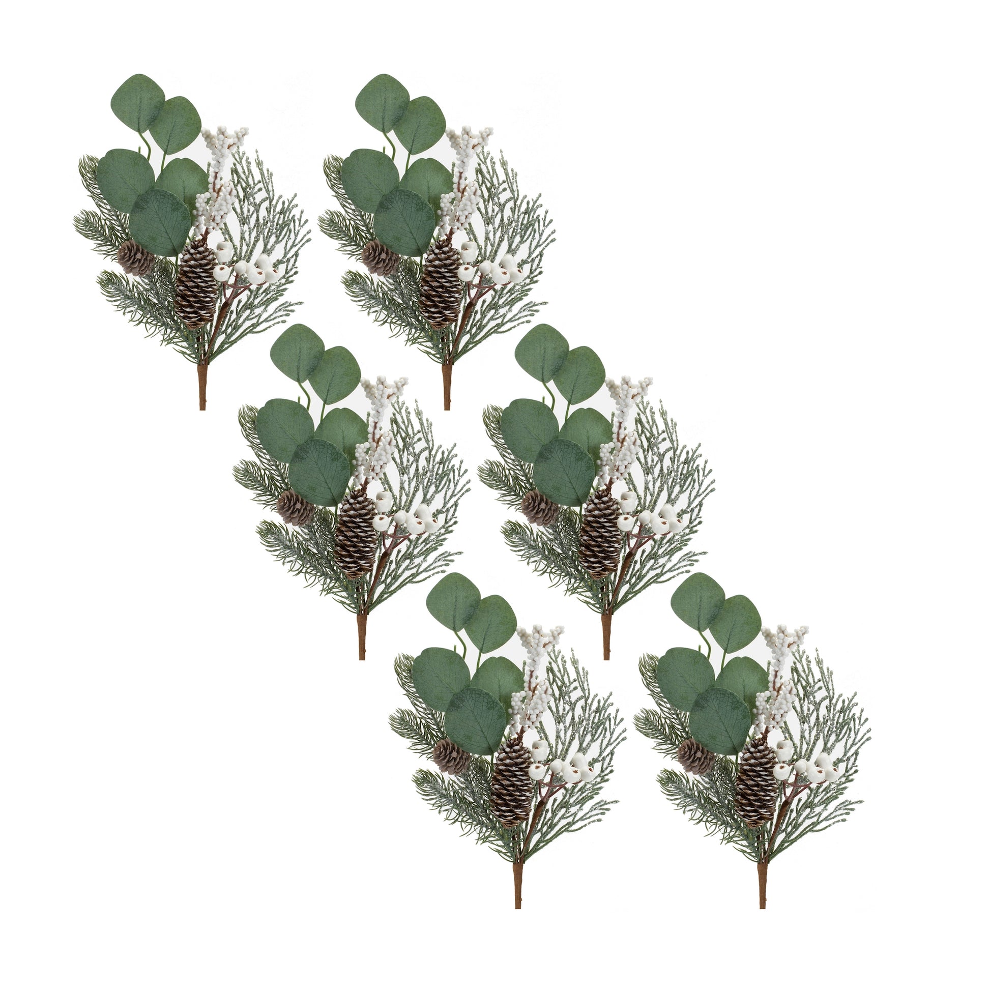 Ring in the holiday season with this beautiful set of Eucalyptus and Pine Picks. Featuring six pieces, this set would be a great addition to your Christmas centerpiece or table arrangement. The varigated eucalyptus and pine foliage paired with the pinecone and berry accents is the perfect combination to create a stunning Christmas display. Add this set to a table vase to make a statement.