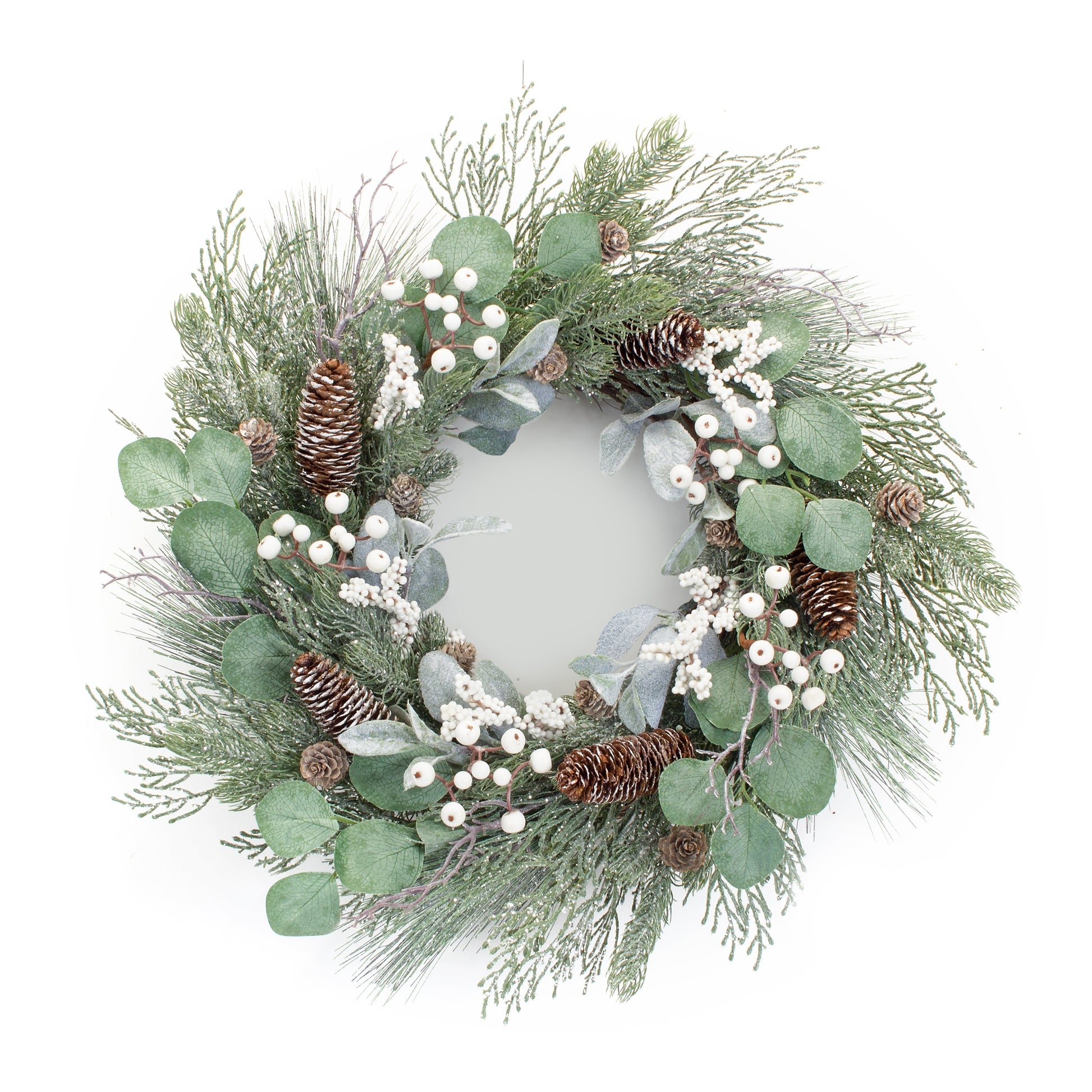 Welcome your guests this holiday season with a beautiful Eucalyptus and Pine Wreath. Perfect for hanging on your front door or in your entryway, this piece will add an elegant touch of nature to your space. The varigated pine and eucalyptus foliage paired with the pinecone and berry accents is the perfect combination to create a stunning Christmas display. The natural twig base gives the piece additional depth and color.