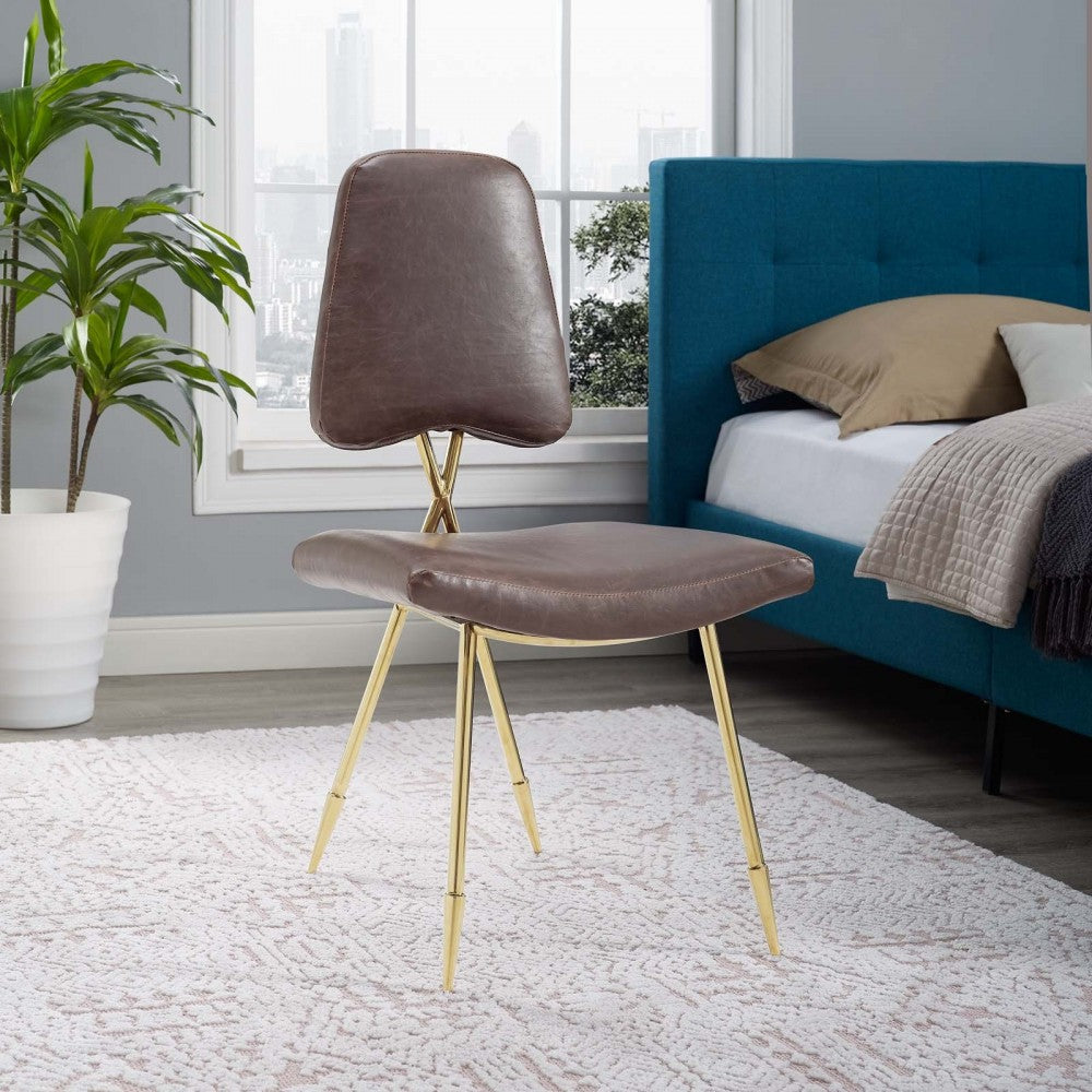 Survey your surroundings with confidence with the Ponder Dining Side Chair. Ponder"™s padded high-density foam seat gently slopes upward providing embracing comfort while the tapered back provides ergonomic support. Finely upholstered in antique faux leather, and supported by a sturdy gold stainless steel frame with four angled mid-century toothpick legs, Ponder makes a striking statement. Transform your dining room decor with a piece that also doubles as an accent chair for the living room, entryway or bedroom.