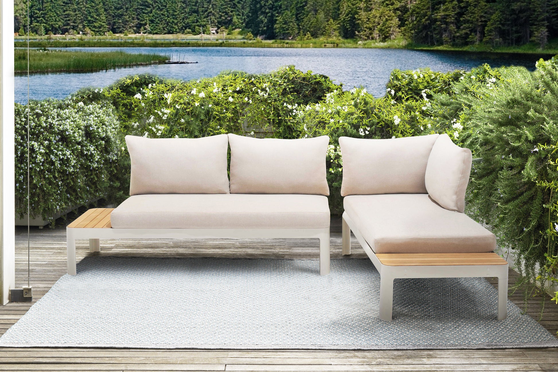 The Portals Outdoor 2 Piece Sofa Modular Set In Light Finish With Natural Teak Wood Accent is a truly ideal statement for the modern patio. The Portals Sofa set is comprised of a sturdy aluminum frame. The sofa sports teak wood surfaces perfect for snack trays and drinks. The Portals Outdoor 2 Piece Sofa Modular Set In Light Finish With Natural Teak Wood Accent feature soft removable cushions for added comfort and style. This modern set is a wonderful addition to the contemporary home and is sure to be the talk of your next gathering.