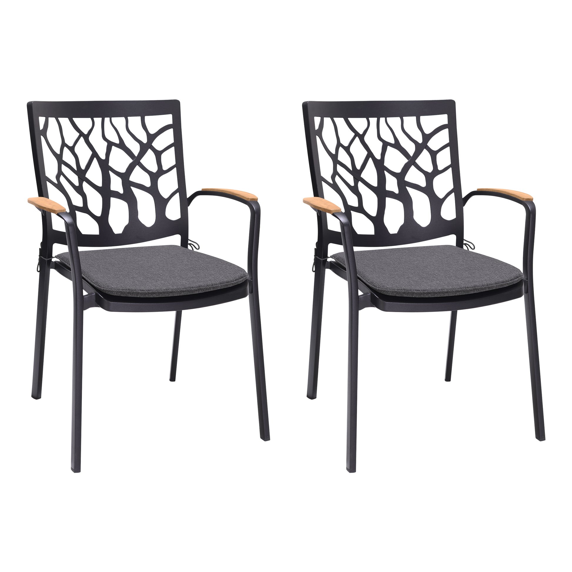 Portals Patio Aluminum Chair in Black with Natural Teak Wood Accent-Set of 2