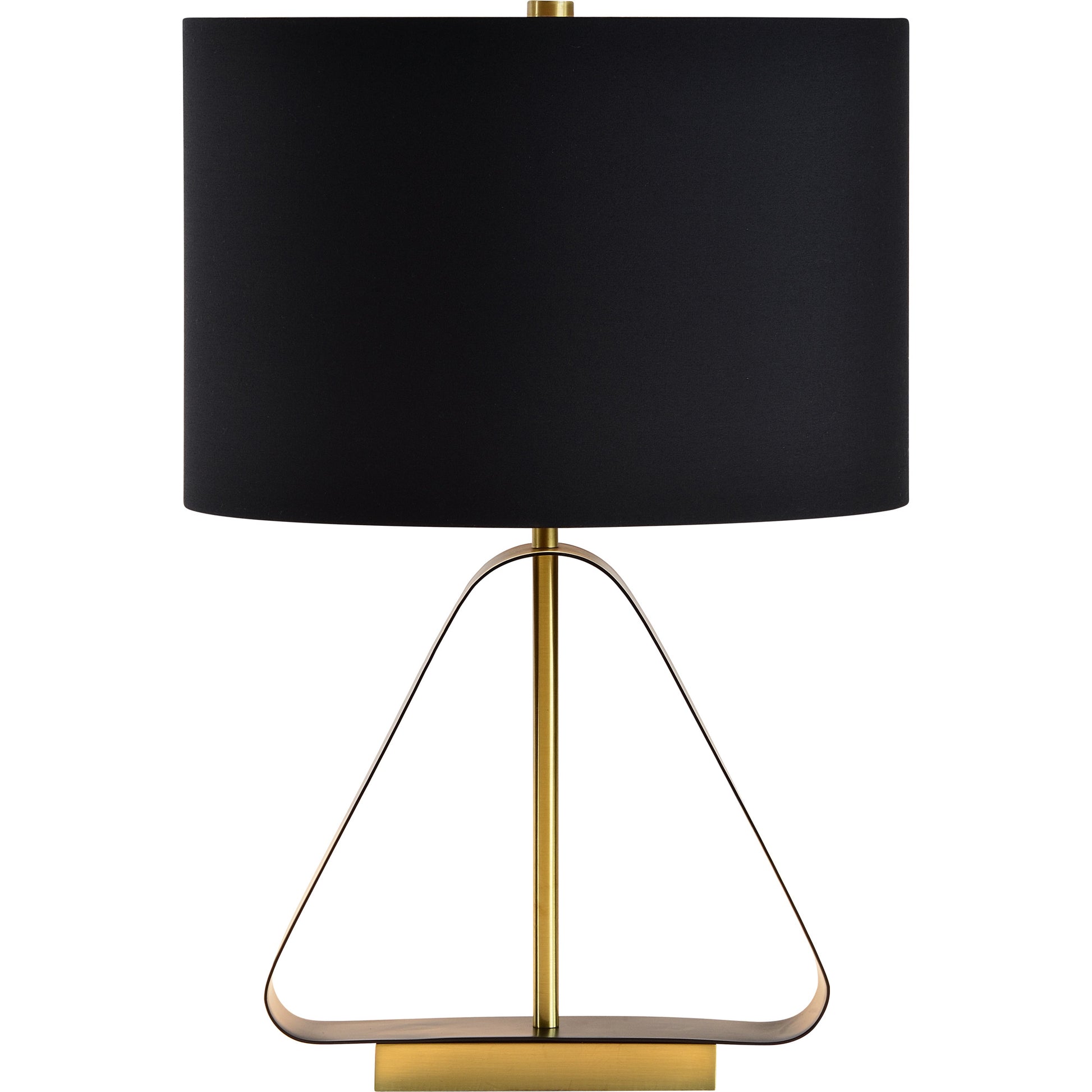 A geometric table lamp adds intrigue to a modern living room. The black cotton shade is offset by the iron structure in black and satin brass plated finishes. The lamp features a three-way switch to set the mood in your space.