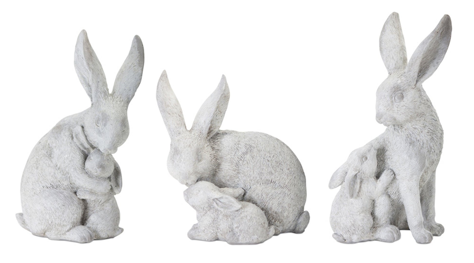 Adorn your home with this beautiful set of Rabbit with Bunny Figurines. Featuring three assorted designs and six total pieces, this set is the perfect addition to your spring decor. The classic grey finish paired with the quality polyresin and stonepowder composition is sure to compliment any style of home decor. Arrange the pieces sporatically around your home to accent other spring decor, or display them altogether in a centerpiece or table display to make a statement. Featured in Melrose International's "Simple Country" collection.