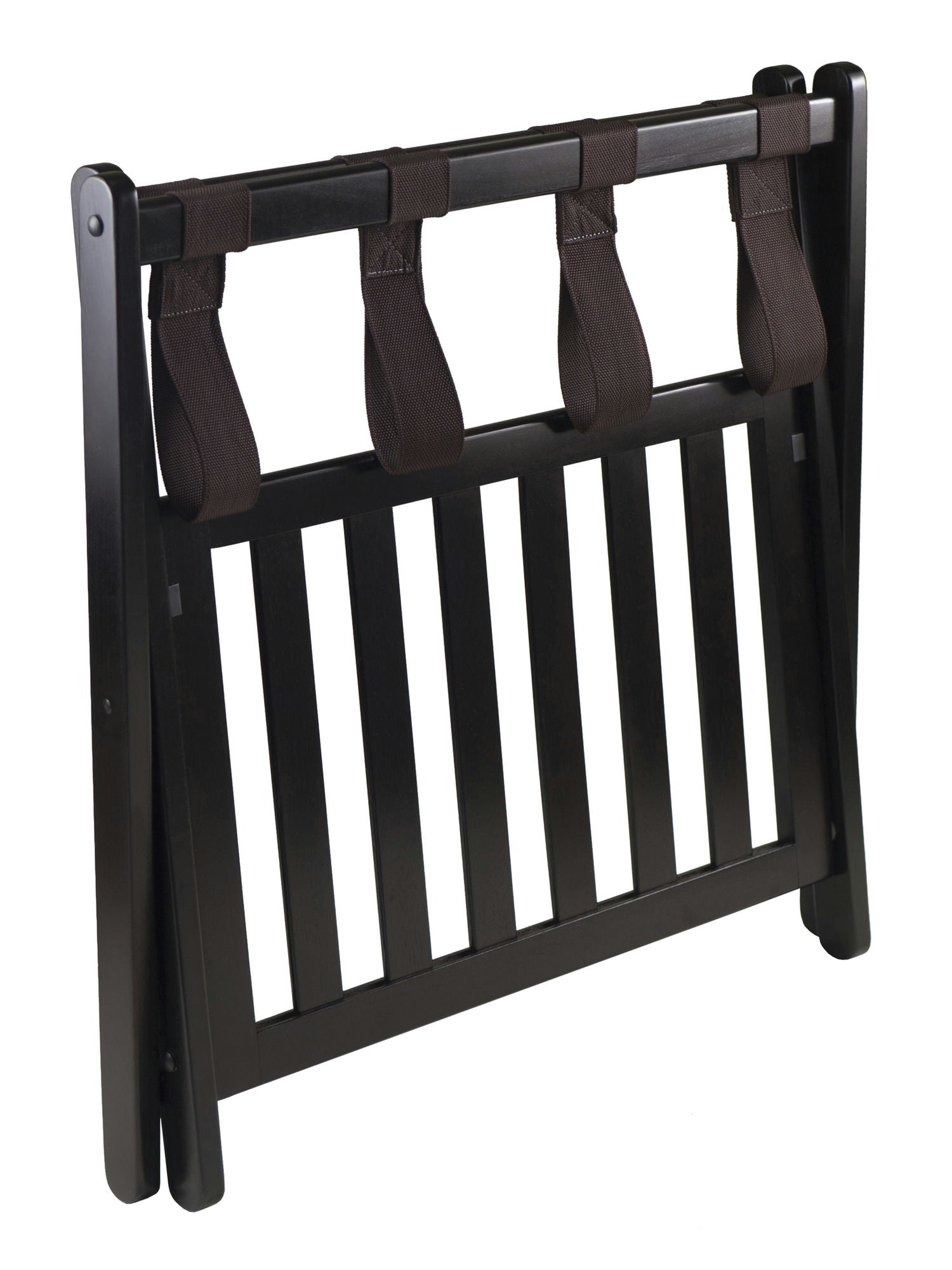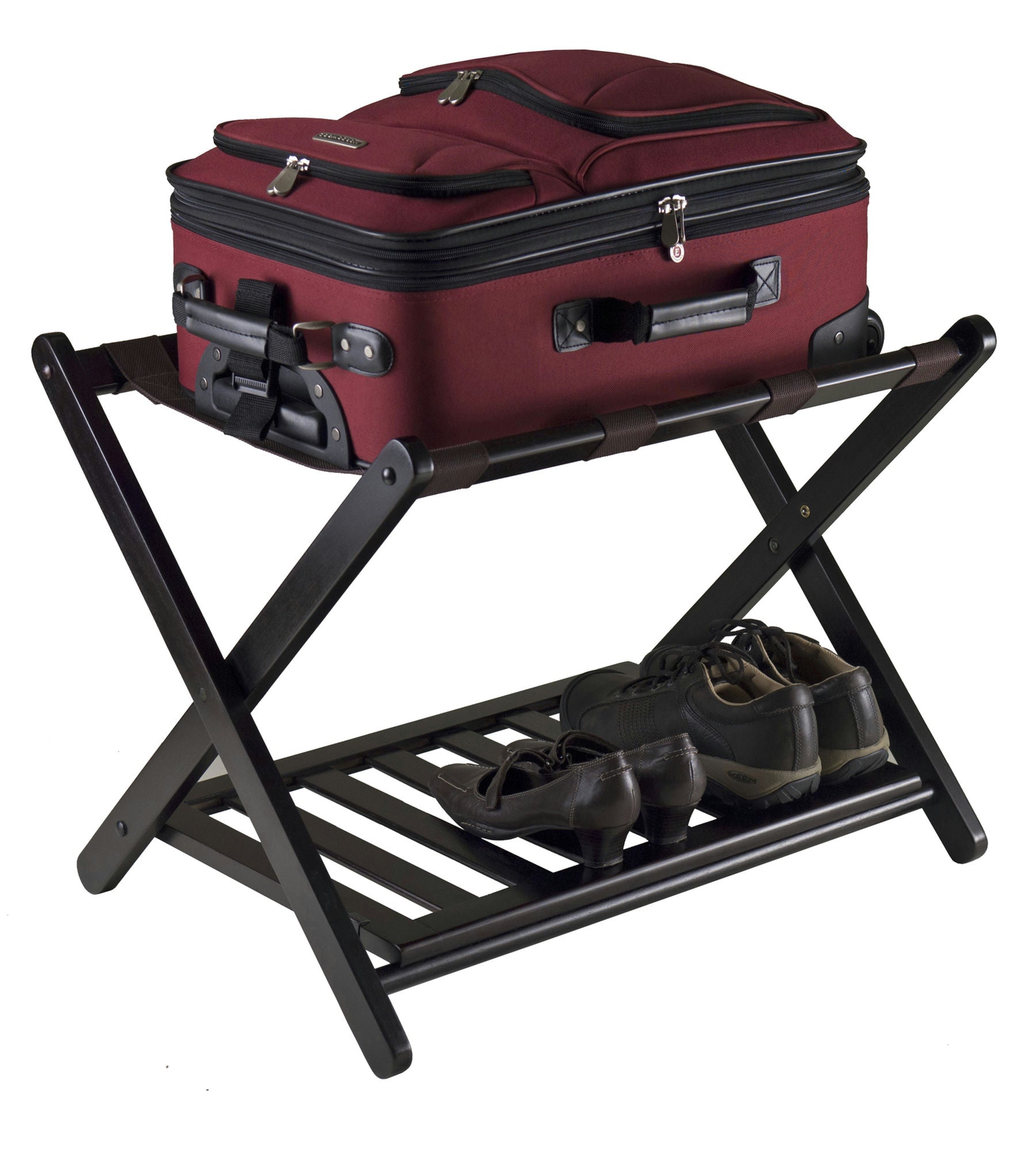The Reese Luggage Rack makes your overnight guest's stay more comfortable with a Solid Wood rack to set their suitcase and unpack. A lower slatted shelf will keep their shoes off the floor or can be used as a place to store personal items. The rack is finished in Espresso with sturdy Black nylon straps, and folds for easy storage when not in use.