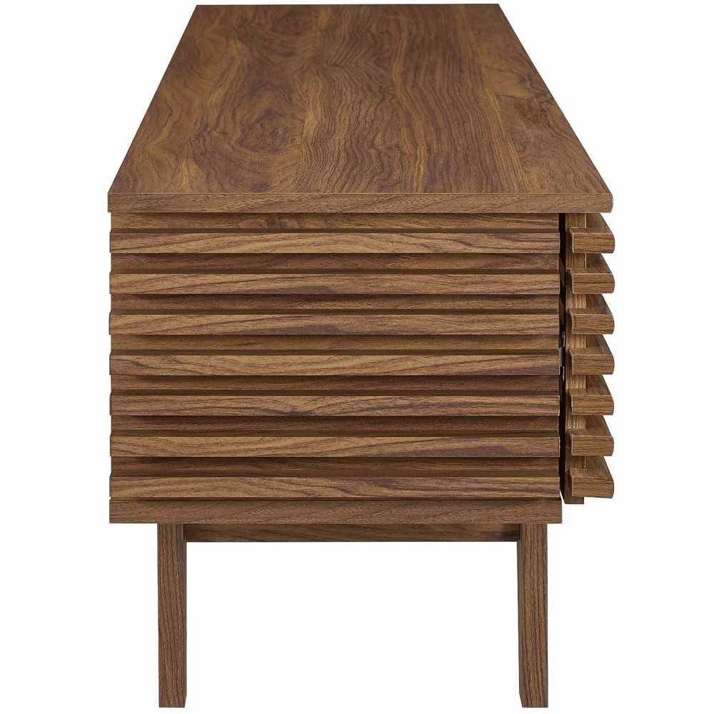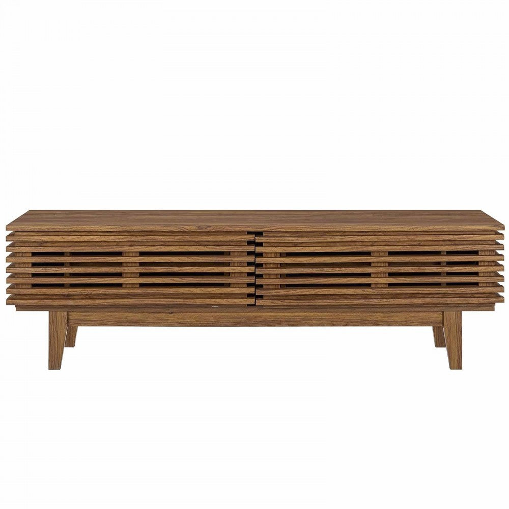 Tap into mid-century aesthetics with the Render 60" TV Stand. This installment of the Render collection features a durable particleboard frame with smooth walnut grain laminate, four tapered wood legs, an adjustable shelf on both sides, two cable management holes, side vertical storage areas, and two bottom-hinged doors for easy access to shelf storage. This versatile mid-century modern living room table features a solid construction with a pleasing look and practical functionality. Perfect for media storage, Transmit accommodates flat-screen TVs up to 66" wide.