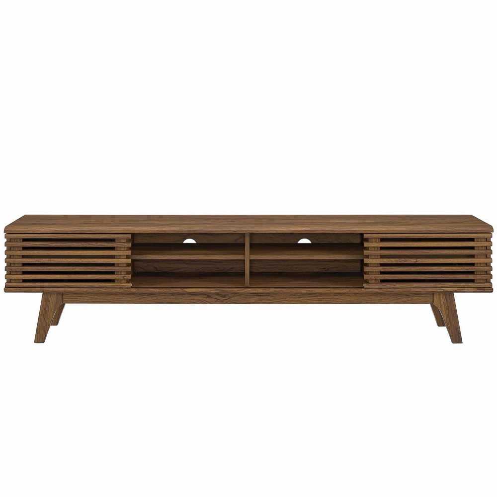 Elevate your entertainment decor with the Envision 70" Media Console TV Stand. Featuring an elegant mid-century silhouette, Envision comes with two sliding white doors for versatile concealed and open storage space, and a full-extension center glide drawer with cable management for spacious media storage. Made of durable particleboard and MDF with walnut grain veneer and flared and tapered legs, store your game system, DVD or Blue-ray player in style while keeping your visual space clean with this versatile media console TV stand. Envision accommodates flat screen TVs up to 78 inches.