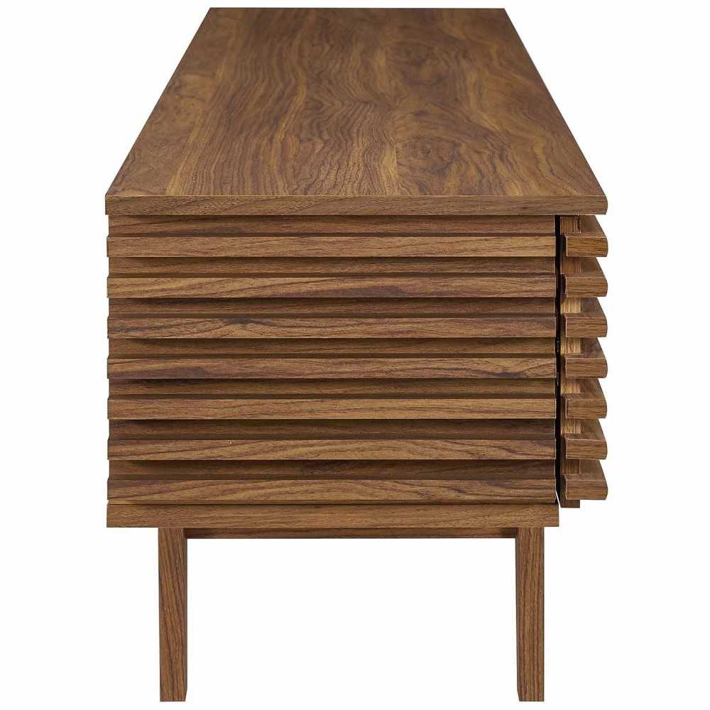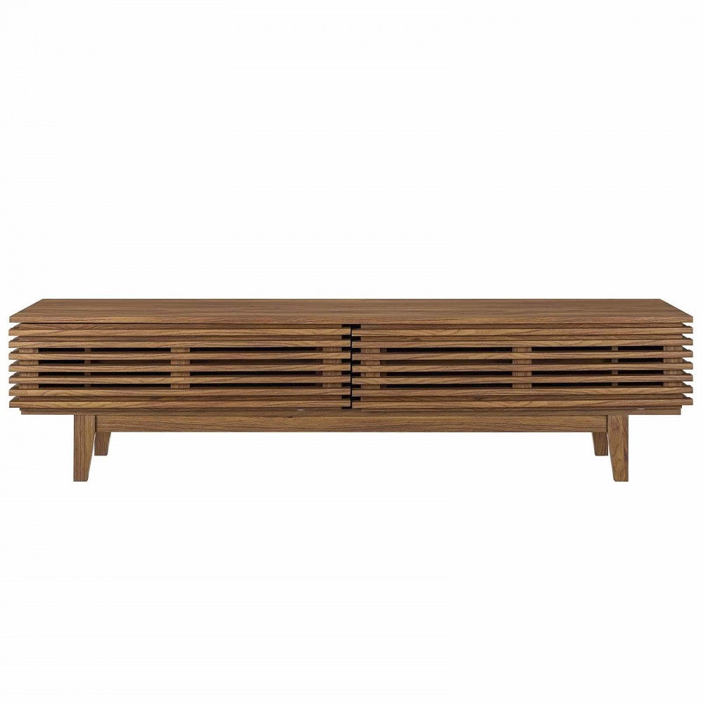 Tap into mid-century aesthetics with the Render 71" TV Stand. This installment of the Render collection features a durable particleboard frame with smooth walnut grain laminate, four tapered wood legs, an adjustable shelf on both sides, two cable management holes, side vertical storage areas, and two bottom-hinged doors for easy access to shelf storage. This versatile mid-century modern living room table features a solid construction with a pleasing look and practical functionality. Perfect for media storage, Transmit accommodates flat-screen TVs up to 78" wide.