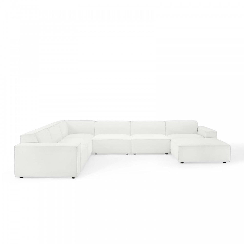 Create your custom living room and lounge area with the Restore Upholstered Fabric 7-Piece Sectional Sofa. The Restore Sectional Sofa appeals to minimalist elegance with a crisp design and broad lines accented with French piping details and polyester fabric upholstery. Dense foam padding and a pocket coil spring system in the cushions offer a luxe seating experience for your living room and lounge. The Restore Living Room Sectional Sofa is solidly constructed from plywood and wood with non-marking foot caps to protect flooring and connectors between modular pieces.