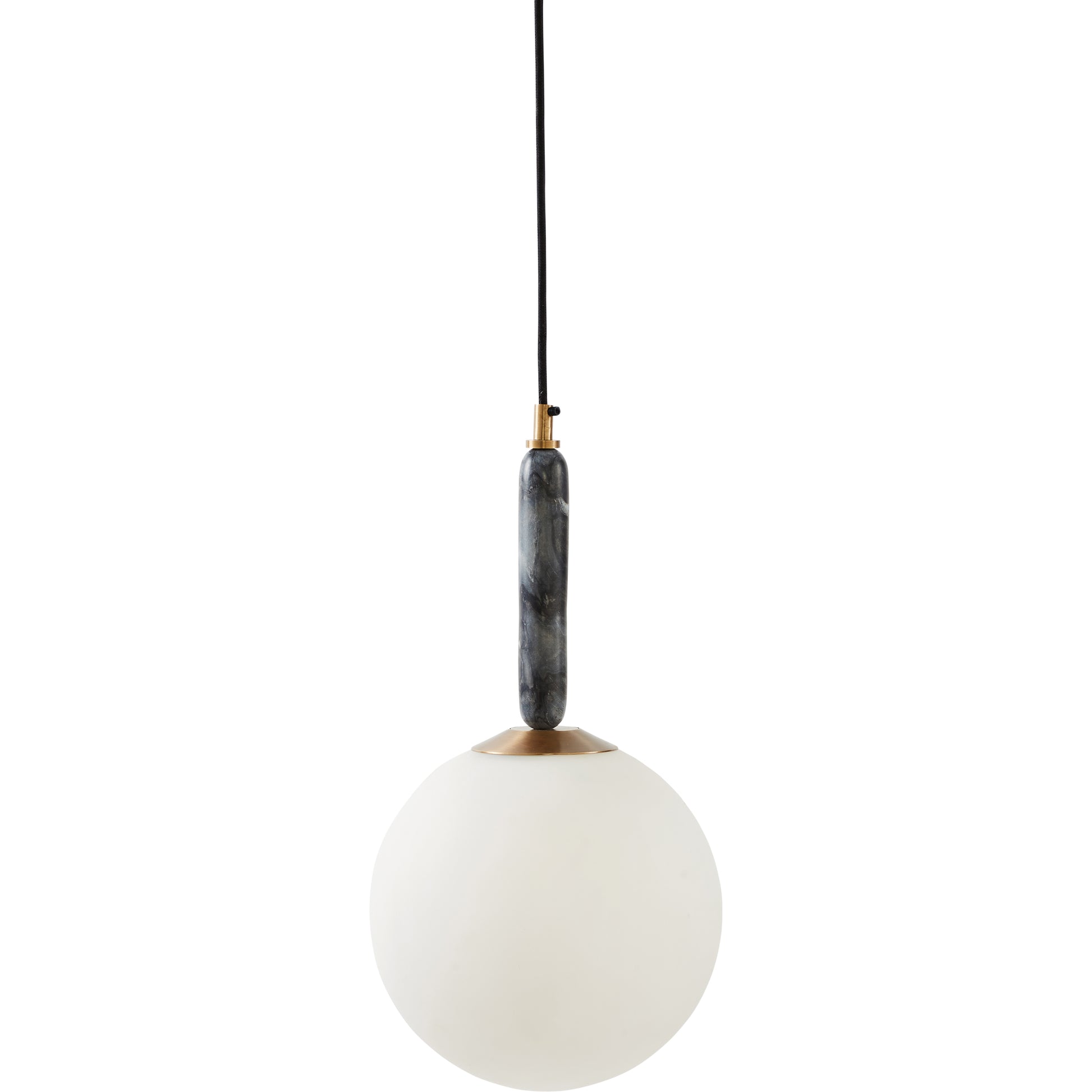 Modern elegance radiates from this light ceiling fixture. The combination of white frosted glass, natural marble, plated antique brass, and matte black powder-coated iron is undeniably stylish. Hang in a cluster or solo for luminous enhancements to your space.