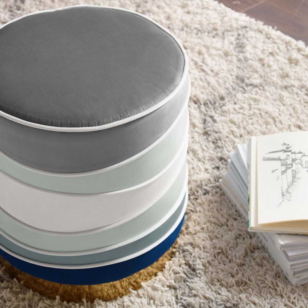 Introduce the quirky charm of the Ribbon Performance Velvet Upholstered Ottoman to energize your living room decor. The Ribbon Accent Ottoman is solidly constructed from wood and plywood with a spooled abstract coastal design and wavy piping for an enchanting addition to your living room, lounge room, bedroom, or other seating area. Dense foam padding is covered by soft and durable stain-resistant performance velvet polyester upholstery. The Ribbon Accent Ottoman has a brushed gold stainless steel hollow base with six non-marking foot caps for flooring integrity. No Assembly Required. Weight Capacity: 441 lbs.