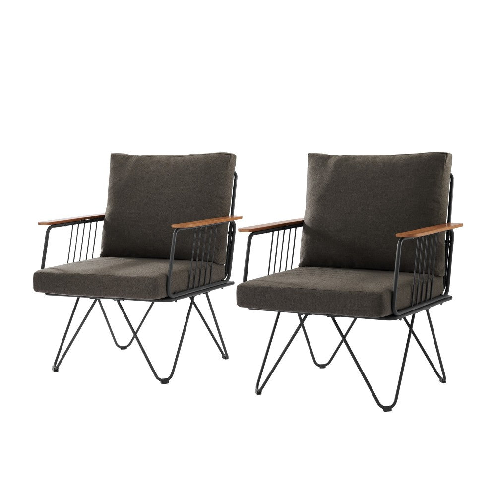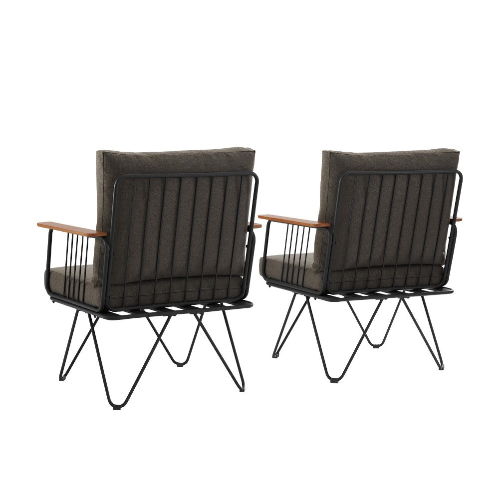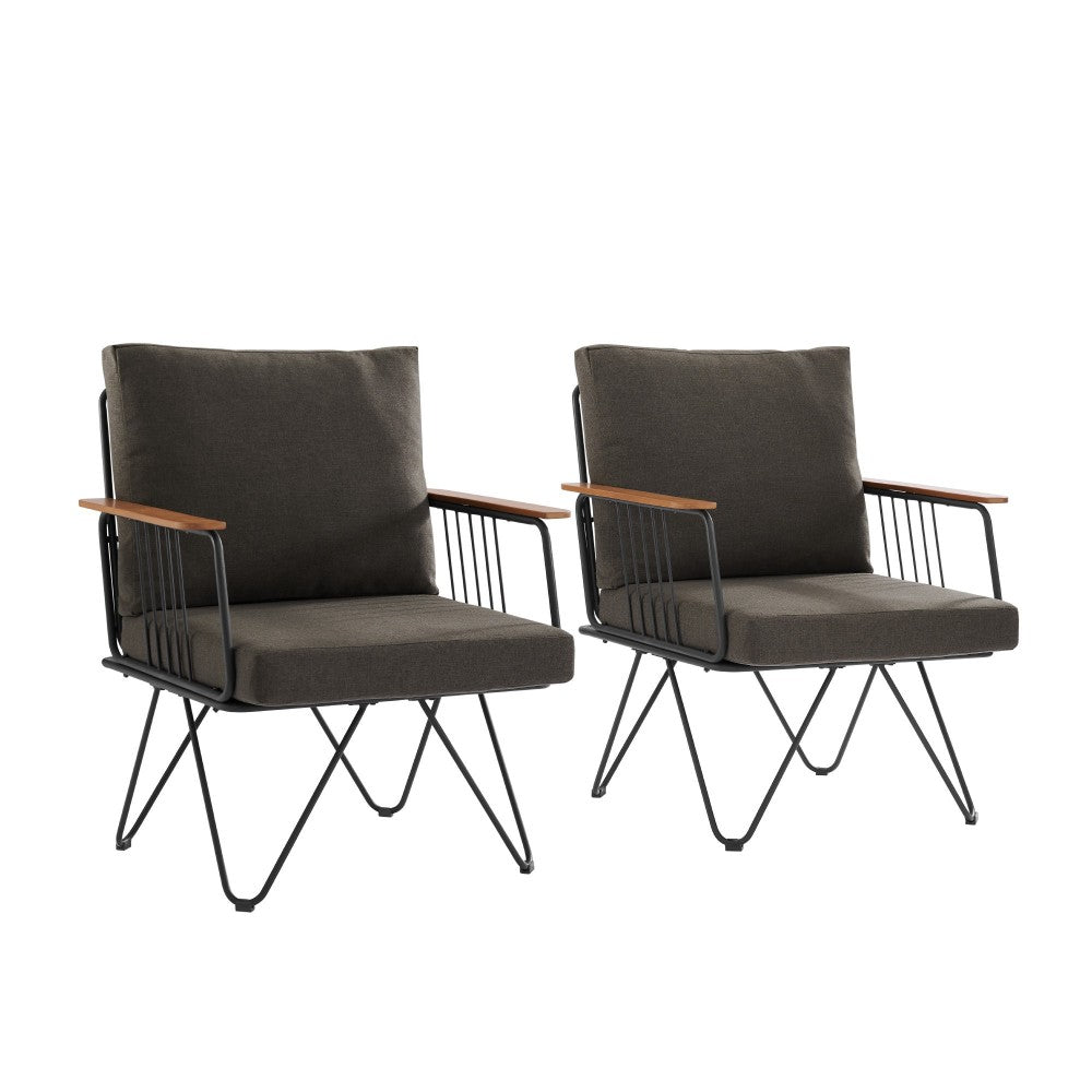 Let the good times roll with this matching outdoor duo. Whether you've hunkered down to watch the sunset, or you're due to enjoy a much-needed respite with roasted marshmallows, this set of two patio chairs is sure to provide classy and comfy seating. Their 4-inch seat cushions and plush backrests will beckon guests to sink into ultimate comfort, and feature removable Olefin covers to make cleaning a breeze. Constructed with powder-coated steel, the metal frame and hairpin legs lend a durable yet modern twist on an outdoor classic. Accented with weather-resistant synthetic wood armrests, this chat set was made to withstand the elements and plenty of pool parties.