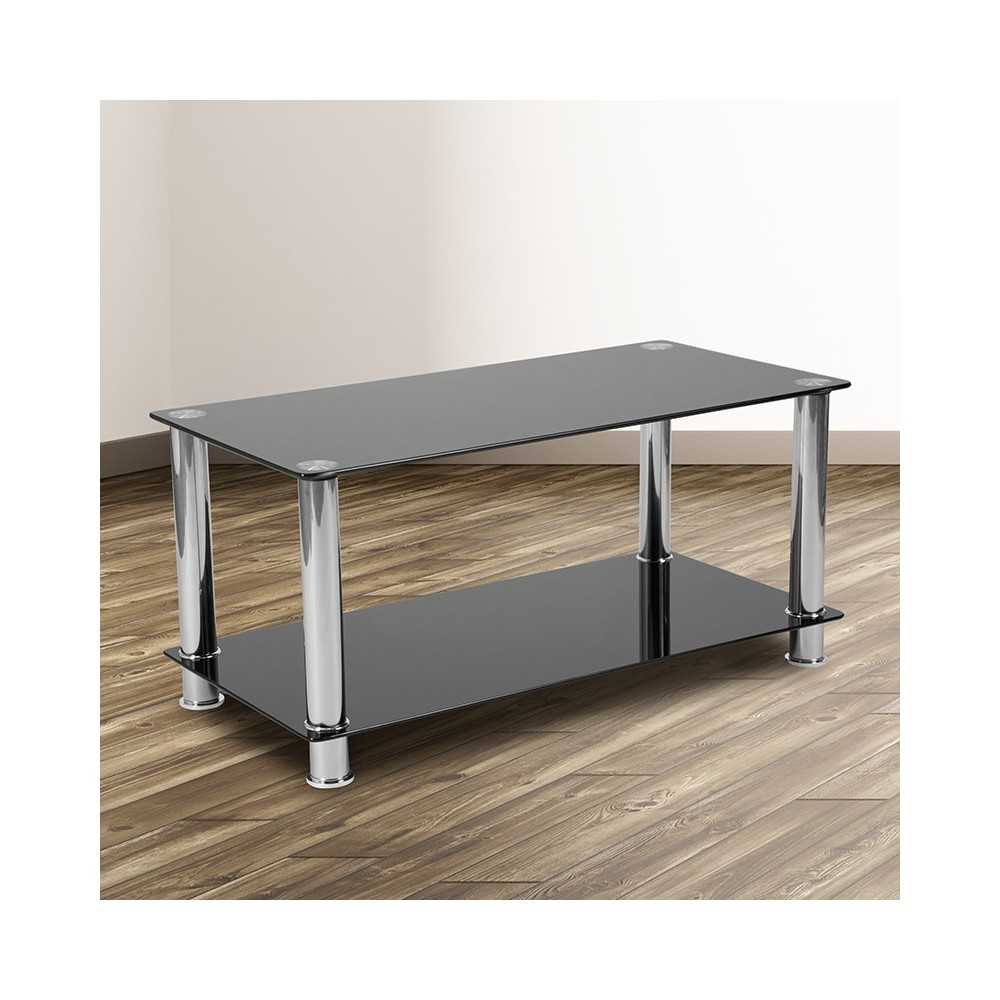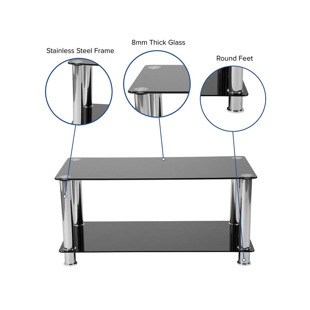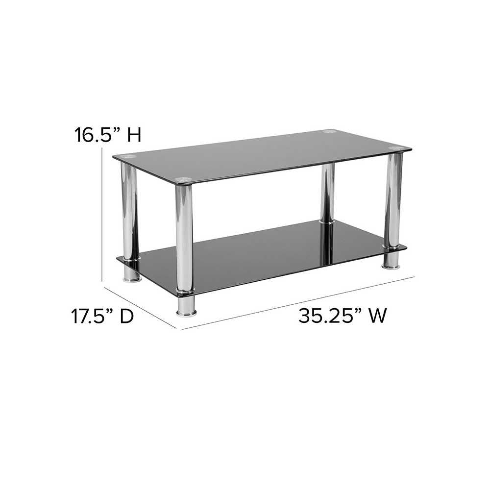 Add elegance to your living room or home office with this black glass coffee table with shelves and stainless steel frame. This table combines an attractive black tempered glass top with a stainless steel frame to provide a contemporary look that's sure to tie any trendy room's presentation together. The bottom shelf serves as a prominent place for displaying decorative items or photos. This center piece will meet all your needs for displaying and holding your common living room items. [HG-112347-GG]