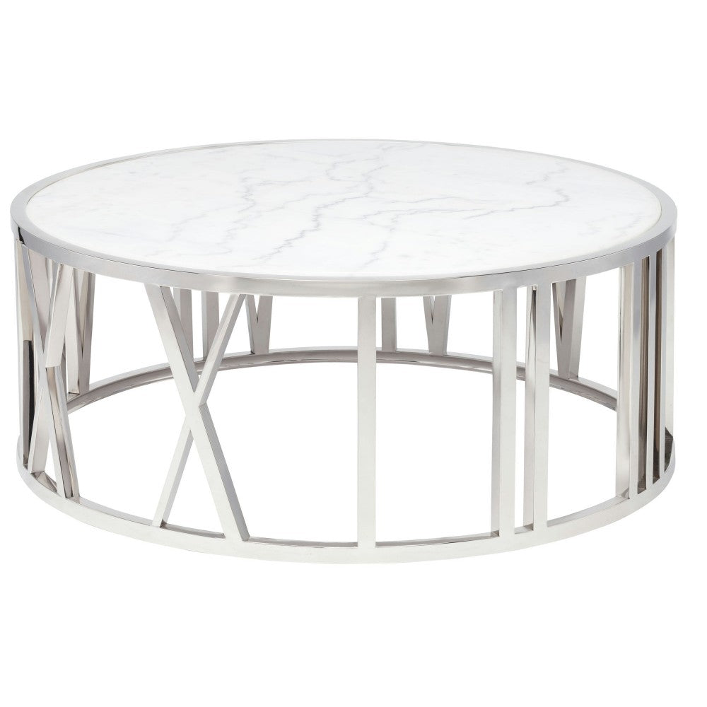 Inspired by the ancients, the classical Roman coffee table features oversized roman numerals in brushed gold stainless steel, framing a tabletop of marble for a look that is refined, sophisticated and subtly erudite. Each piece of marble is expertly crafted out of a unique piece of natural stone, creating beautiful variations and one-of-a-kind details.