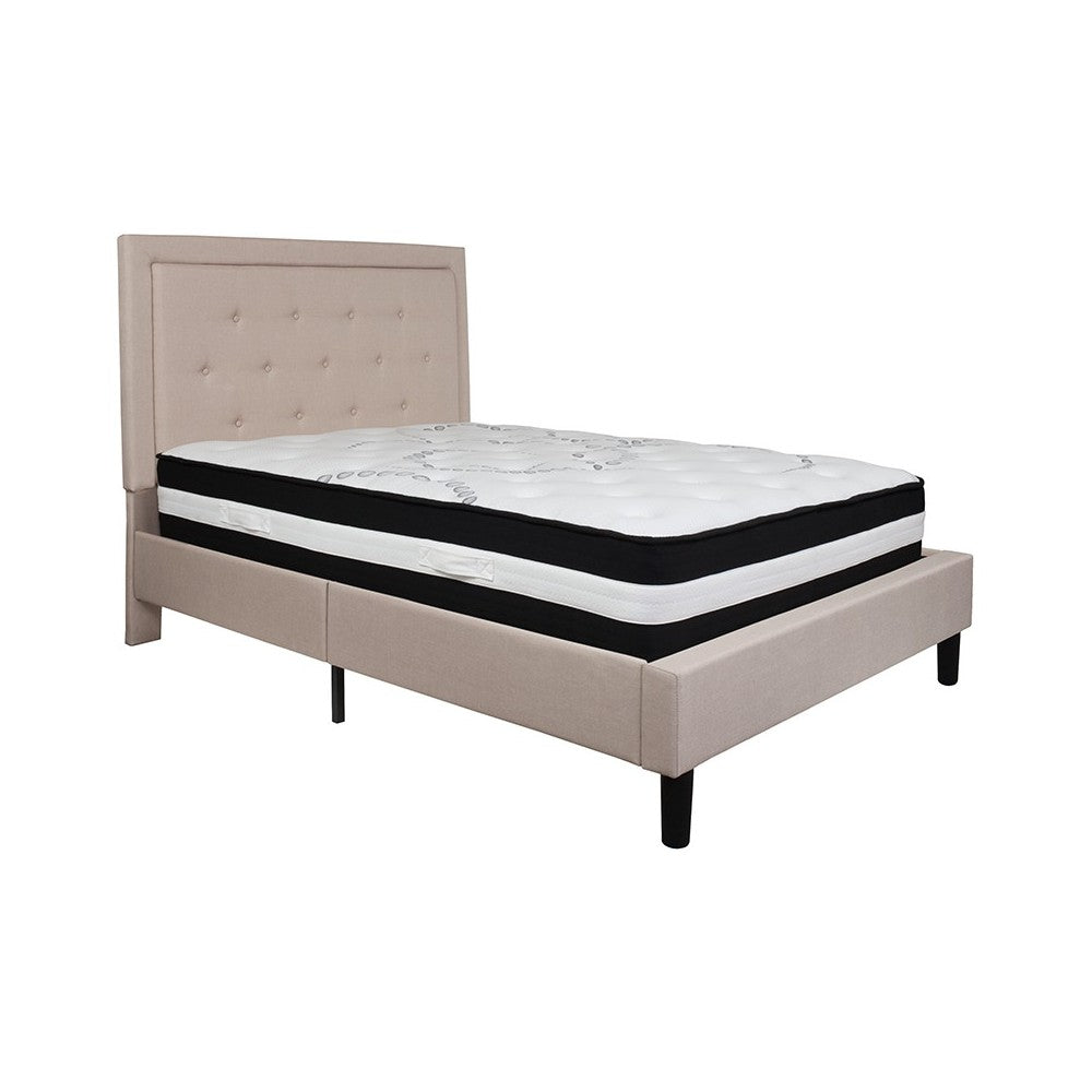 Roxbury Full Size Tufted Upholstered Platform Bed in Beige Fabric with Pocket Spring Mattress