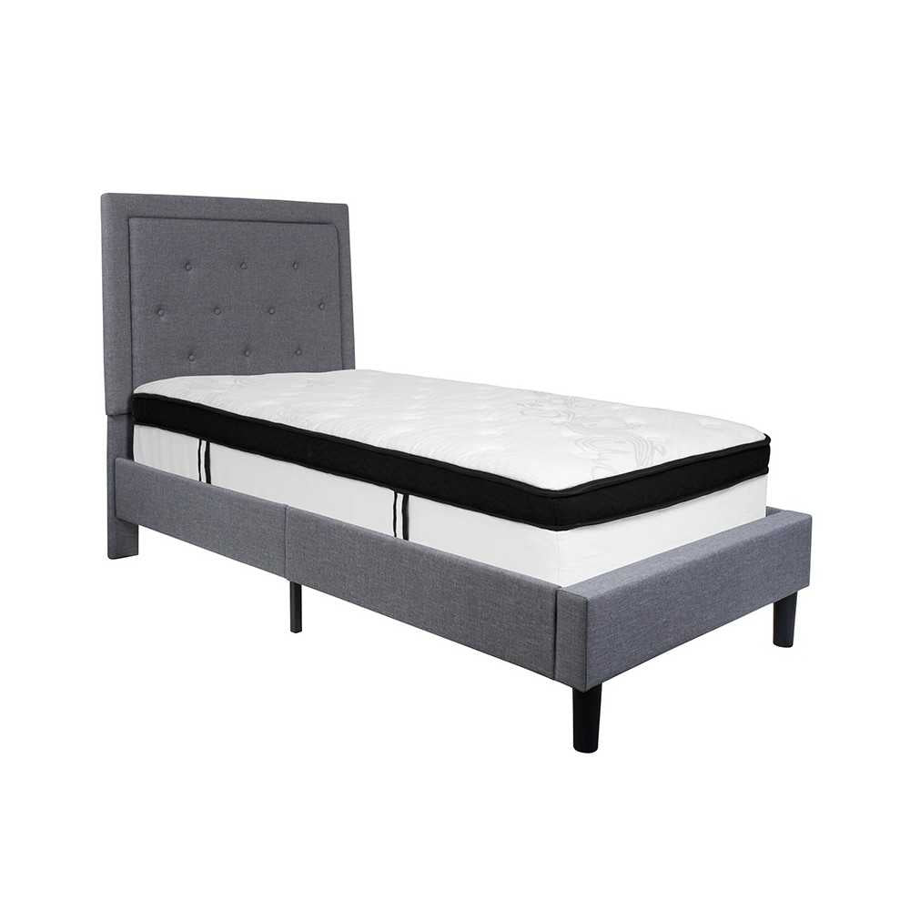 Roxbury Twin Size Tufted Upholstered Platform Bed in Light Gray Fabric with Memory Foam Mattress