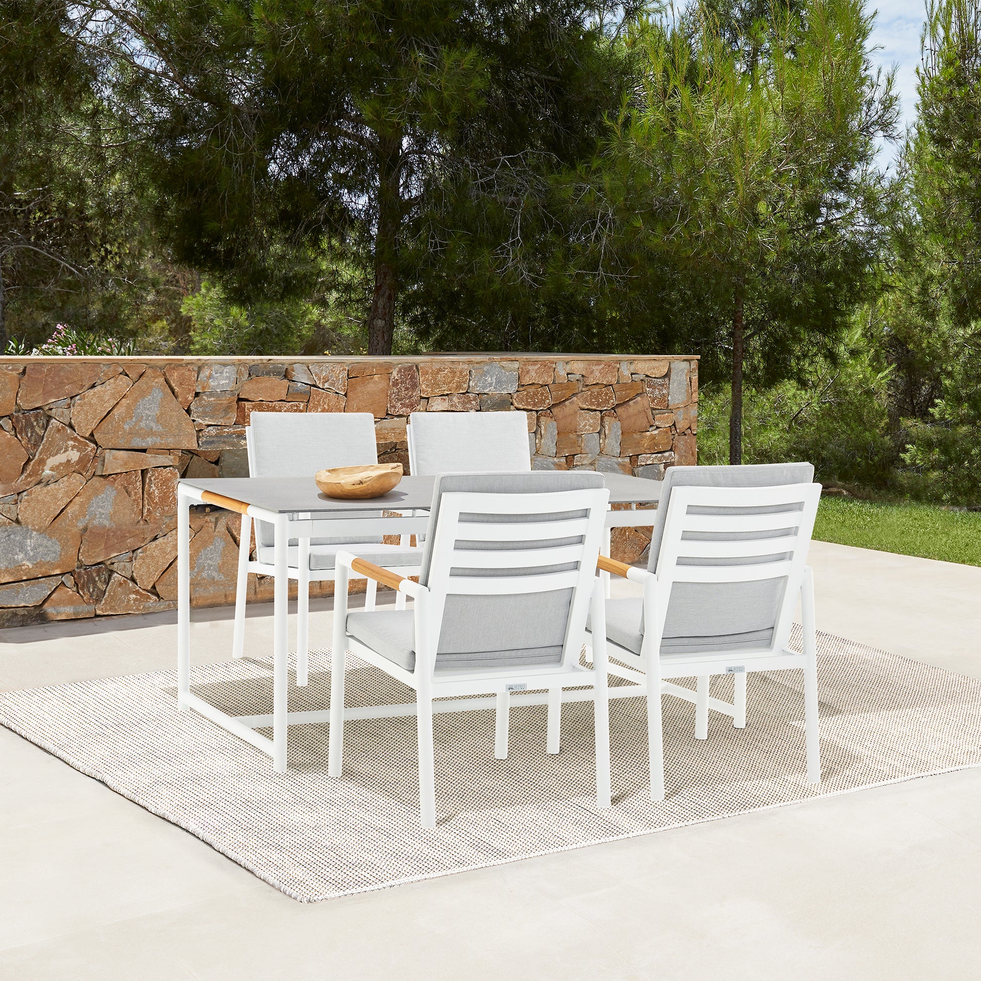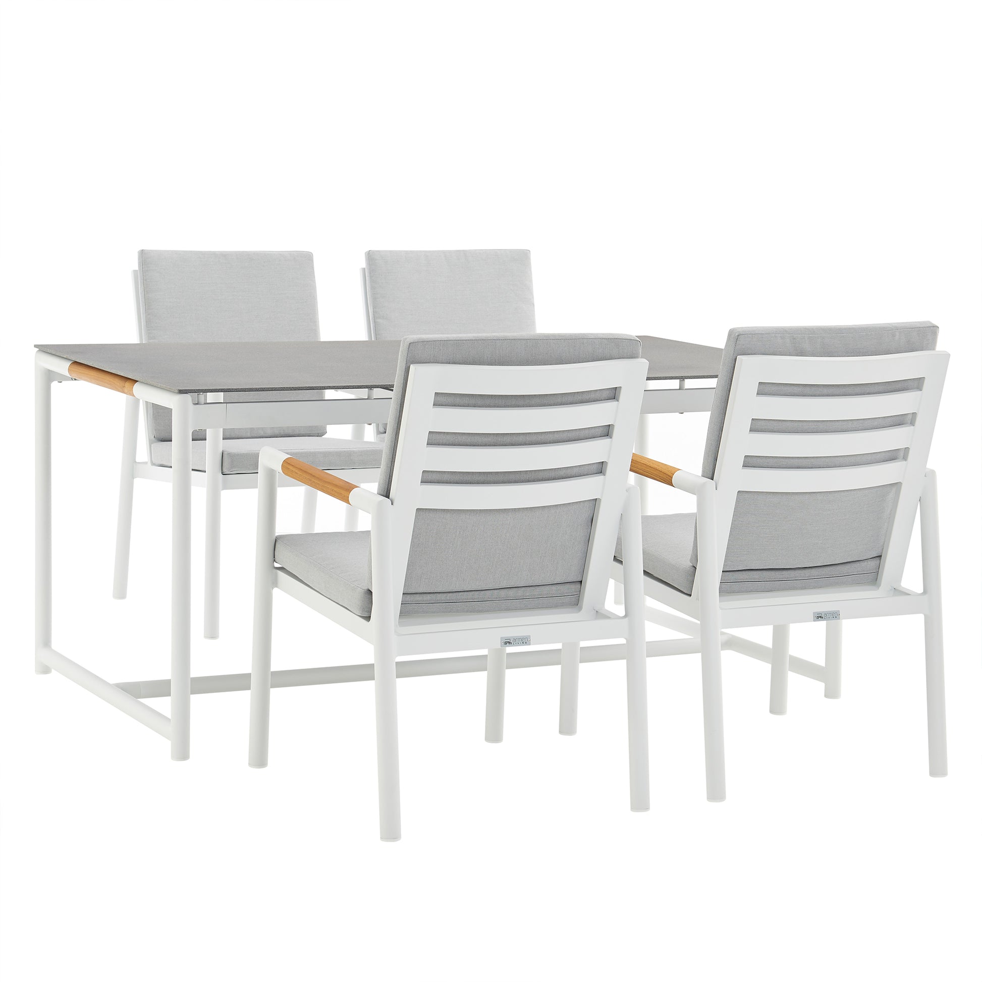 The Royal 5 Piece White Aluminum and Teak Outdoor Dining Set with Light Gray Fabric from Armen Living will bring a clean, sleek, and modern aesthetic to your outdoor patio area. This table is able to seat up to six chairs around its 63” width - perfect for entertaining family and friends. The wonderfully crafted Royal dining table features a unique tabletop made of two layers - the bottom layer being a glass top and the top layer being a stone top. The UV and water-resistant cushions are ideal for any outdoor space and conveniently feature a zipper closure, making maintenance and upkeep a breeze. The Royal aluminum and teak outdoor dining chair features a chic durable and lightweight aluminum frame complete with warm teak accents on the arms. This combination is timeless, and its modern look is sure to please for many seasons and years to come. This beautiful multi-layered top is durable and robust - capable of withstanding inclement weather and everyday wear and tear.