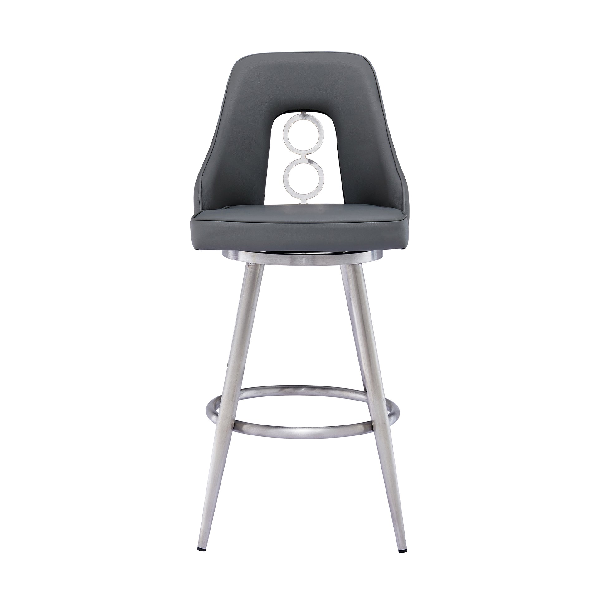 The Ruby 30" Bar Height Swivel Black Faux Leather and Brushed Stainless Steel Bar Stool from Armen Living is the perfect addition to any home or apartment! The Ruby’s soft faux leather upholstery is wrapped around a high-density foam cushion that provides ultimate comfort without compromising style. The circular metal feature in the back makes for a stylish addition as well as providing you with easy breathable seating. The sturdy metal legs are tipped with floor protectors, assuring that the barstool will not slip on or scratch hardwood or tile floors and presents a ring footrest that further accentuates its convenience. The armless design makes the Ruby an easy stool to incorporate into your kitchen, office, home bar, or den where it can come as close to the surface as needed. A 360-degree swivel function allows your guests to engage regardless of their place in the room at parties or gatherings, making this kitchen stool ideal for entertaining friends and families.