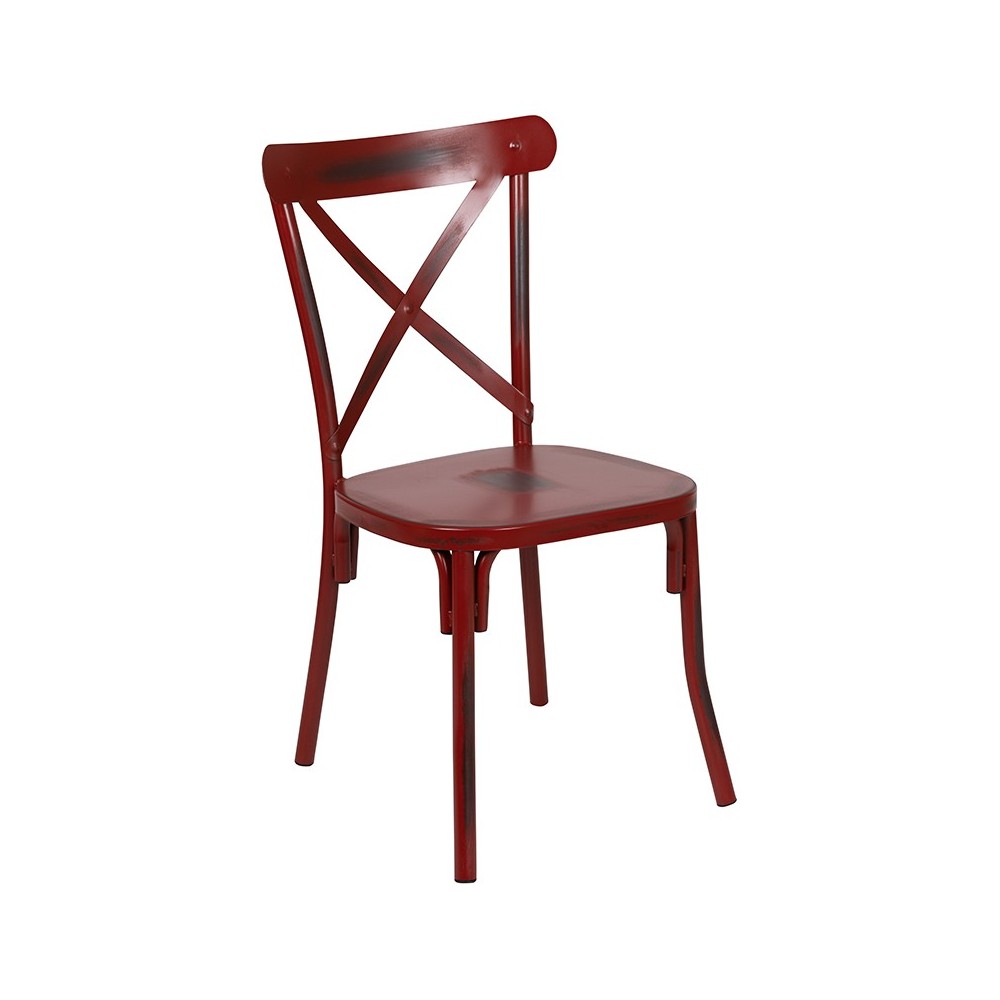 Add a comfortable, welcoming look to your restaurant, bistro or your dining room table with this distressed rustic red finished metal cross back chair. This versatile chair will work well in any design scheme from farmhouse to open concept to industrial. Pair this X-back chair with any style dining table for a chic, eclectic look that adds a unique design element. Chair arrives fully assembled making setup quick and easy. Ultra-strong, this steel dining chair holds up to 500 pounds to accommodate most users. This cross back dining chair features welded joint assembly for strength and a powder coated frame for long-lasting durability. Plastic floor glides will protect your flooring from damage and ensure smooth movement. Use this chair as a standalone for extra guest seating, add another for a cozy conversation area or purchase enough to fill the spaces around your dining table. Spills clean easily with a water based cleaner. No matter what your design style, this metal X-back kitchen dining chair will be a crowd pleaser. [XU-DG-60699-RED-D-GG]
