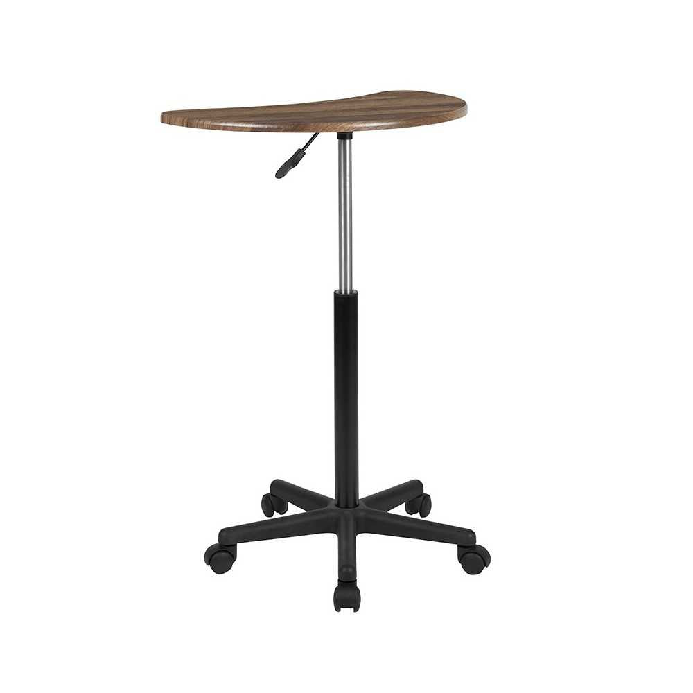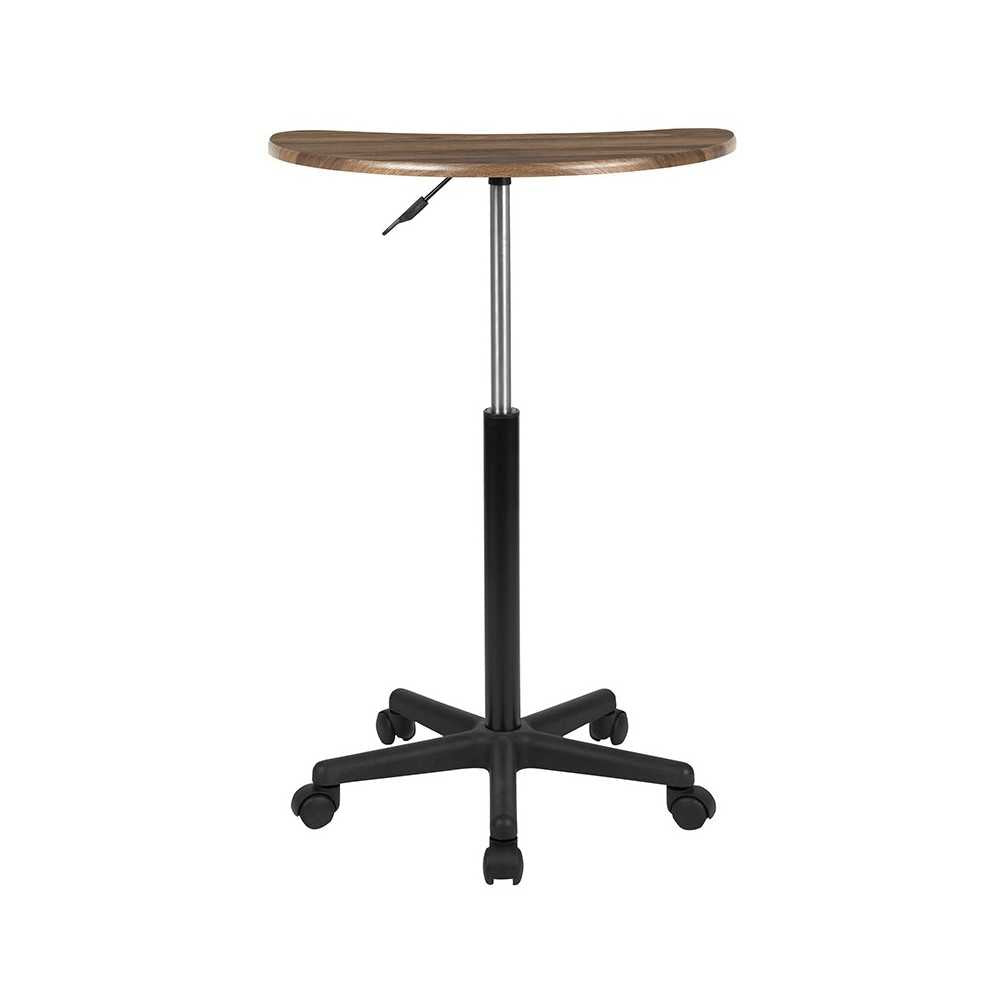 Zip around with ease with this handy little desk that can be used while working on your laptop or as a speakers' lectern. It features a half-moon shaped desktop in a Rustic Walnut laminate finish that's height adjustable, allowing you to complete tasks while sitting down or standing up. Raise and lower the desktop using the conveniently located pneumatic frame height adjustment lever. The heavy-duty, nylon base with dual wheel casters allow you to roll across all flooring. Undo unhealthy work habits with the Maple Sit to Stand Mobile Laptop Computer Desk that offers a versatile workspace on wheels for your home or office. [NAN-JN-2792-RU-GG]
