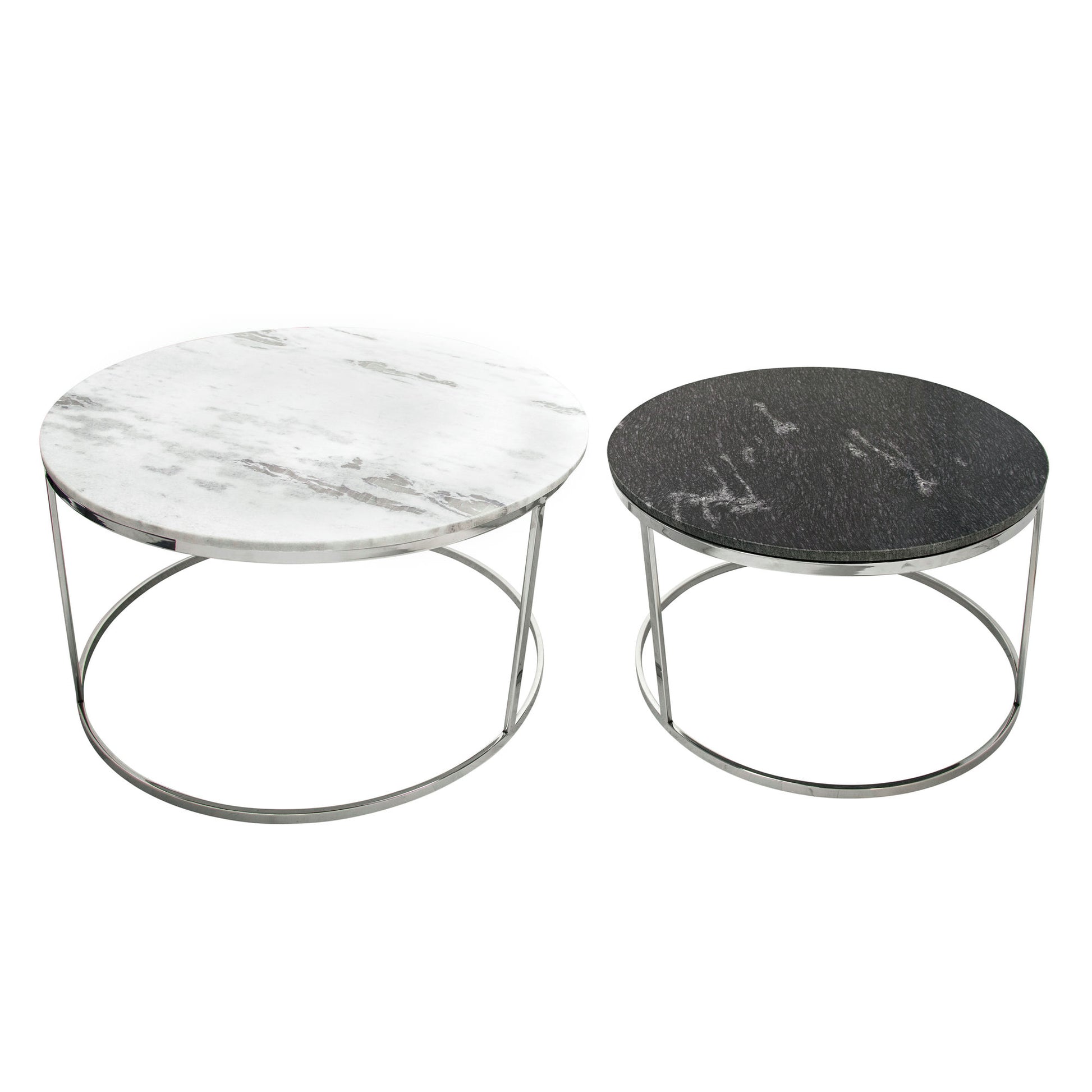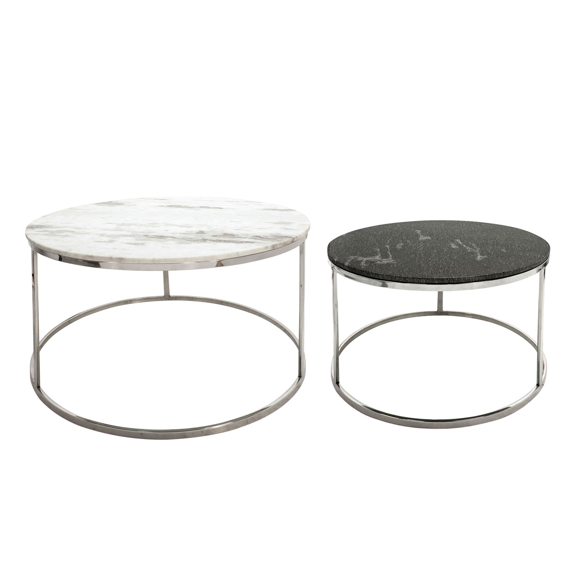 This elegant set of coffee tables can be the center focal point of your abode. Inspired by glam decor, this set features contrasting black and white marble tops that will enhance any neutral design within your home. With a metal base for durability, given a silver glossy finish for additional style. The perfect way to modernize your home.