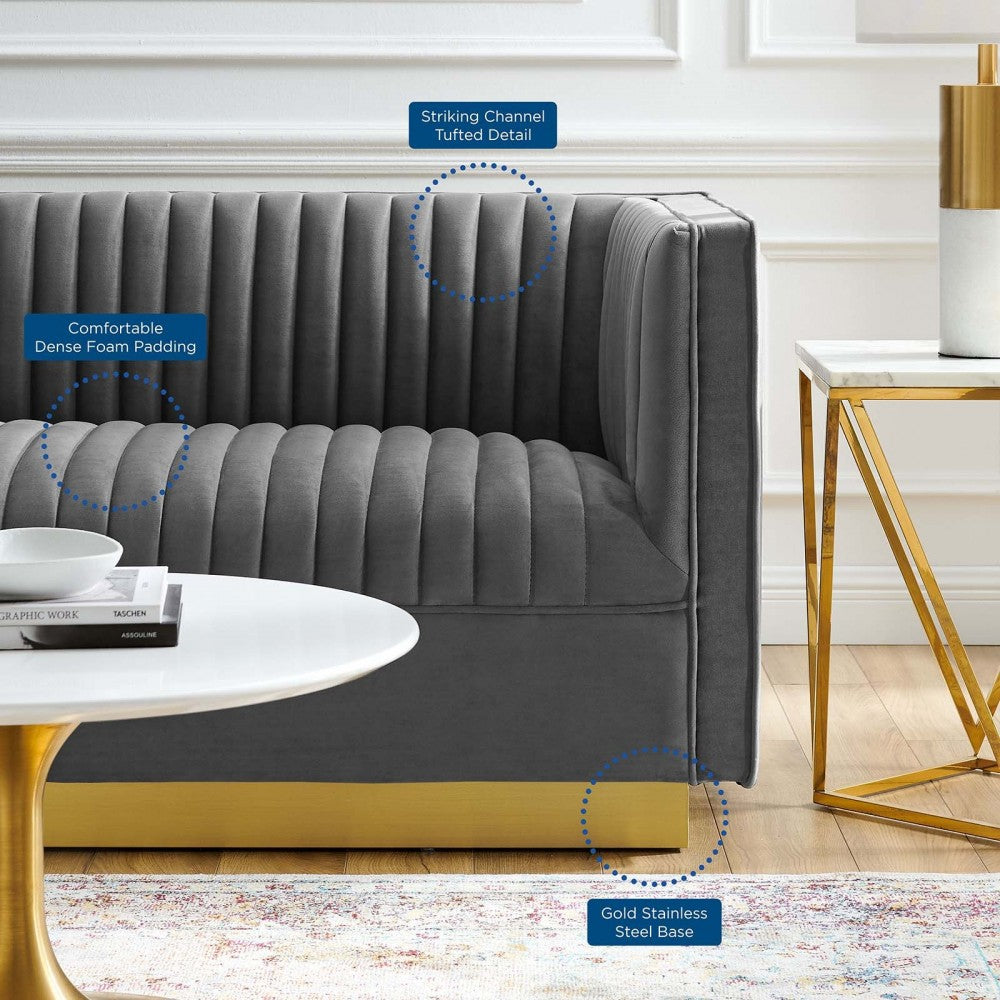 Glamour radiates from the organic linear design of the Sanguine Performance Velvet Loveseat. Relax and follow the interior vertical channel tufting for a streamlined effect that adds retro modern glamour to your living room, lounge room, or home office. Soft, stain-resistant performance velvet upholstery creates a luxurious tactile experience while dense foam padding with individually wrapped spring coil system provides ultimate comfort and support. This two-seat sofa's palatial accents and premium comfort rest securely on a gold stainless steel base that complements any contemporary modern home or apartment. Maximum weight capacity: 600 lbs.