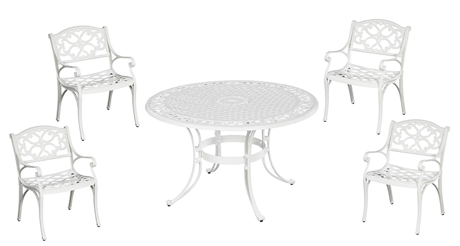 The difference between an average backyard and an open air sanctuary is found the classic comfort and traditional style that Sanibel delivers. This 5-piece dining set includes a round table and four arm chairs, all made of cast aluminum with a powder-coated finish and a clear coat that offers total protection from the elements. The tabletop and seat design allows water to quickly drain through to prevent pooling or staining. The center umbrella hole includes a cap to cover it when not in use.