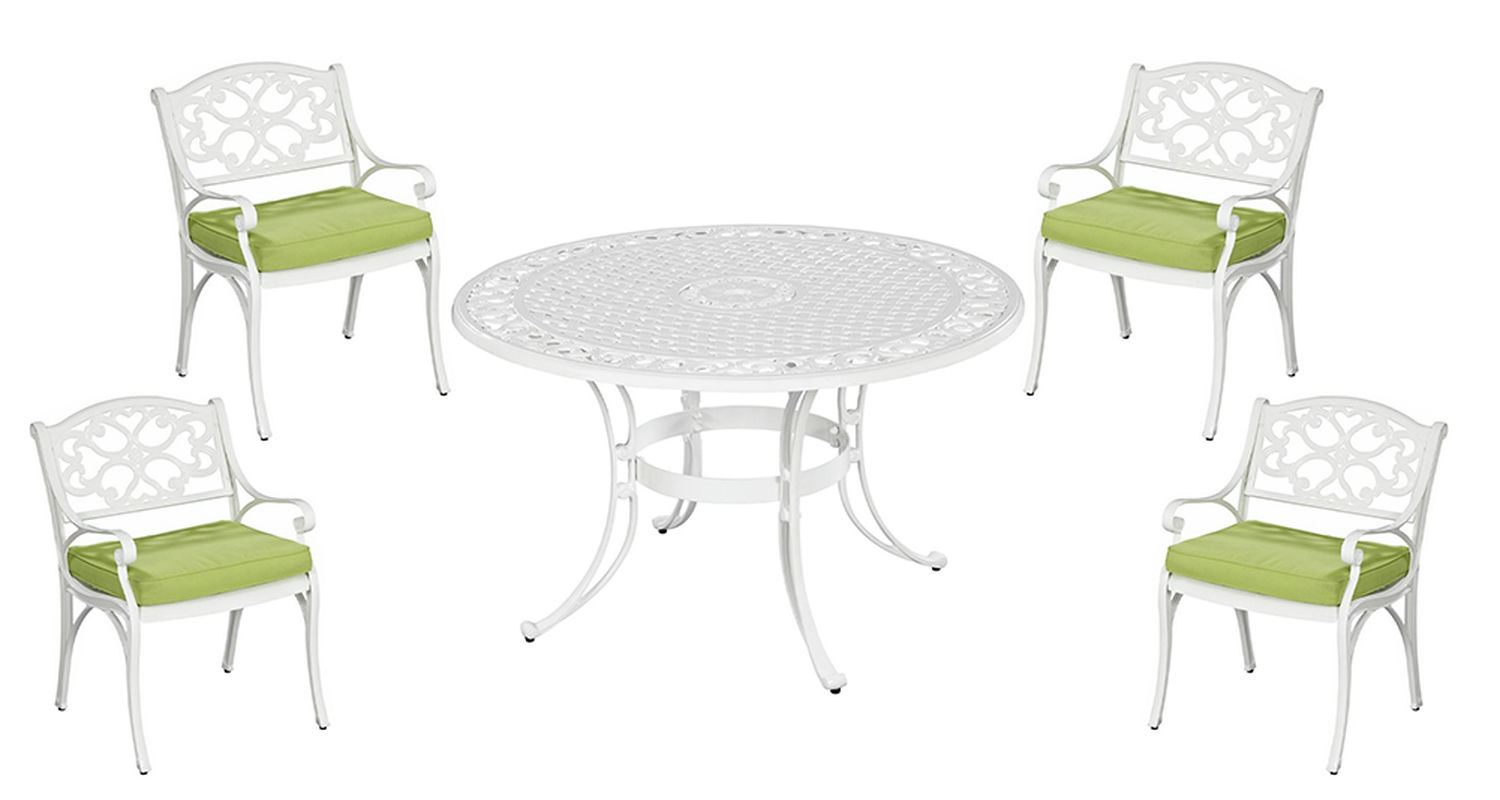 This Sanibel 5-piece dining set includes a round table and four arm chairs with cushions, all made of cast aluminum with a powder-coated finish and a clear coat that offers total protection from the elements.Table size: 48"W x 48"D x 30"H. Chair size: 22"W x 21"D x 32"H.