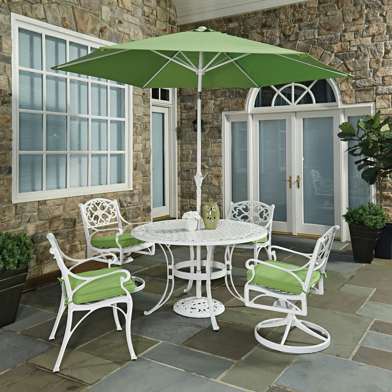 The difference between an average backyard and an open air sanctuary is found the classic comfort and traditional style that Sanibel delivers. This 6-piece dining set includes a round table, two swivel chairs and two arm chairs with cushions, and an umbrella with stand. The table and chairs are made of cast aluminum with a powder-coated finish and a clear coat that offers total protection from the elements. The tabletop and seat design allows water to quickly drain through to prevent pooling or staining. The center umbrella hole includes a cap to cover it when not in use.