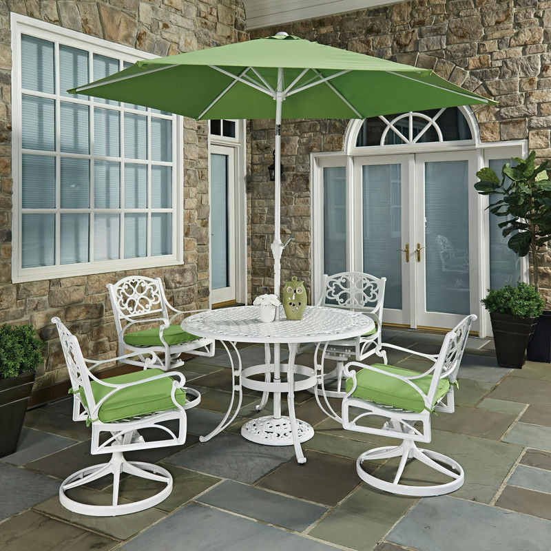 This Sanibel 7-piece dining set includes a round table, four swivel chairs, with cushions, and an umbrella with stand. The table and chairs are made of cast aluminum with a powder-coated finish and a clear coat that offers total protection from the elements. The center umbrella hole includes a cap.