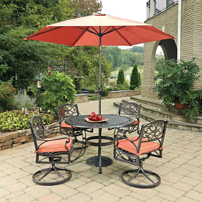 This Sanibel 7-piece dining set includes a round table, four swivel chairs, with cushions, and an umbrella with stand. The table and chairs are made of cast aluminum with a powder-coated finish and a clear coat that offers total protection from the elements.
