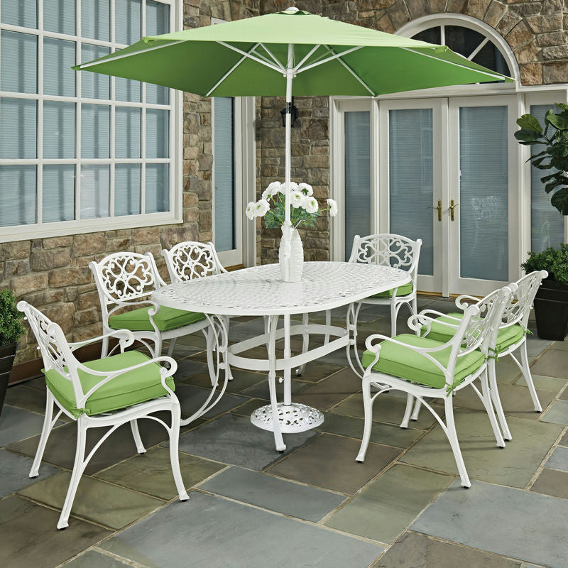 The Sanibel arm chair with seat cushion features a cast aluminum frame with a powder-coated finish and a clear coat that offers total protection from the elements. The seat design allows water to quickly drain through to prevent pooling or staining.