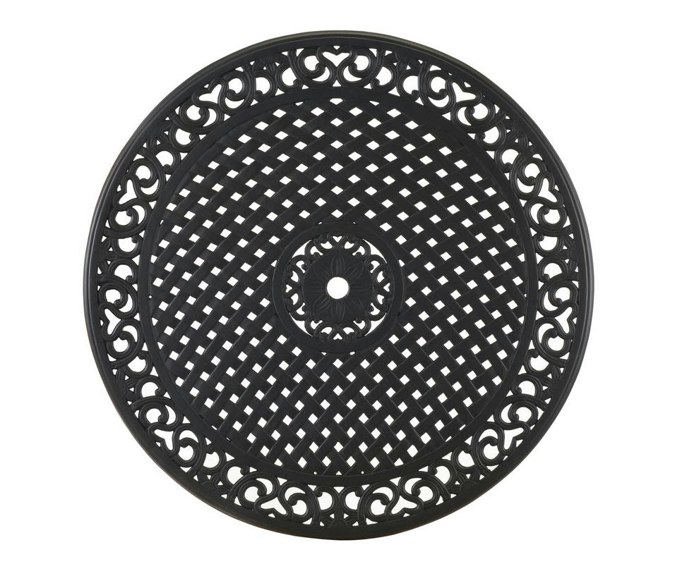 This Sanibel 42" outdoor dining table is made of cast aluminum with a powder-coated finish and a clear coat that offers total protection from the elements. The table top design allows water to quickly drain through to prevent pooling or staining.