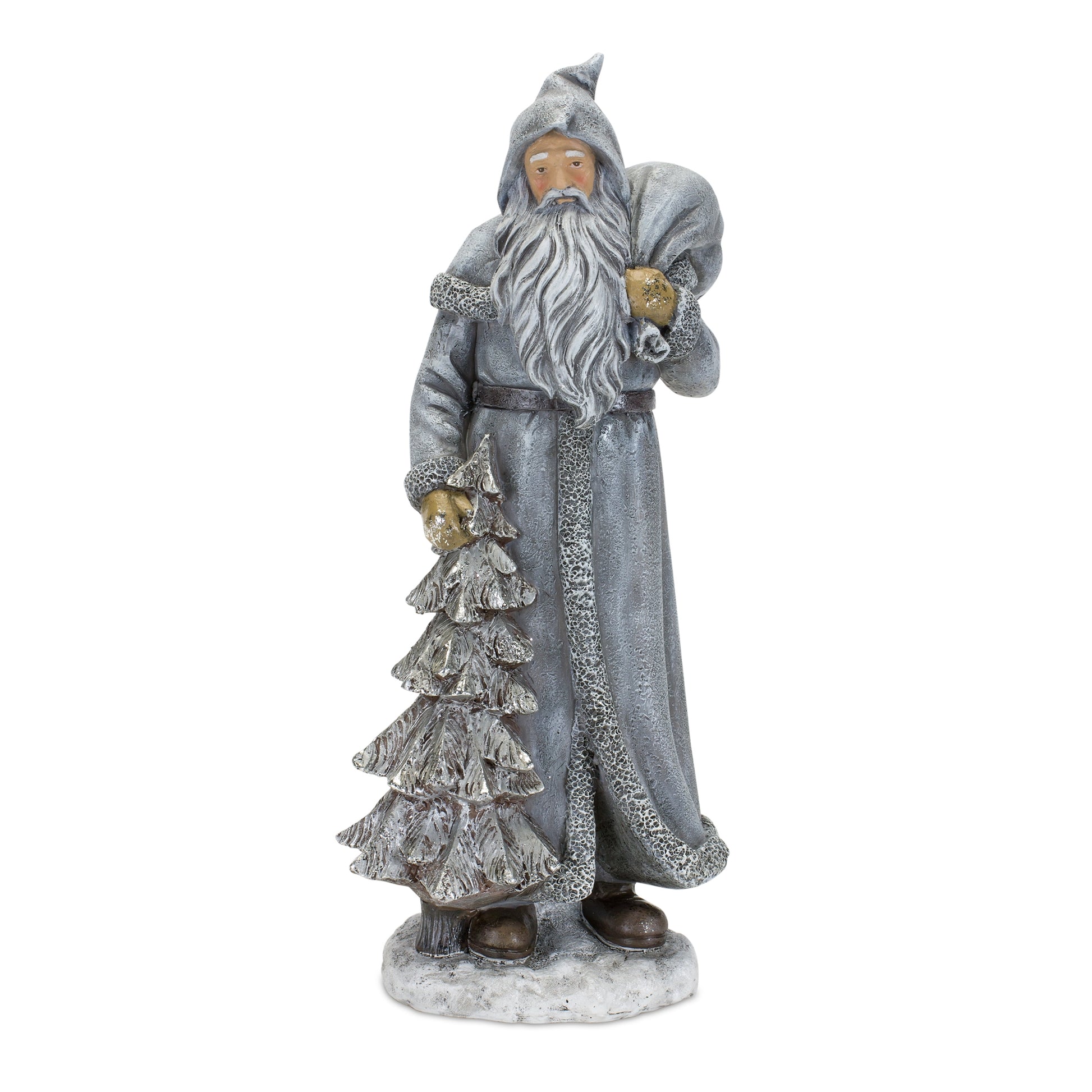 Ring in the holiday season with this beautiful set of Santa Figurines. Featuring two assorted designs, the rustic hooded Santa design paired with the pine tree and toy bag accents makes this piece a great addition to any style of holiday decor. The quality polyresin and stone powder composition is sure to last for seasons to come. Each measuring 13" tall, this set would be great for a floor display, or could be used to add height to a table arrangement.