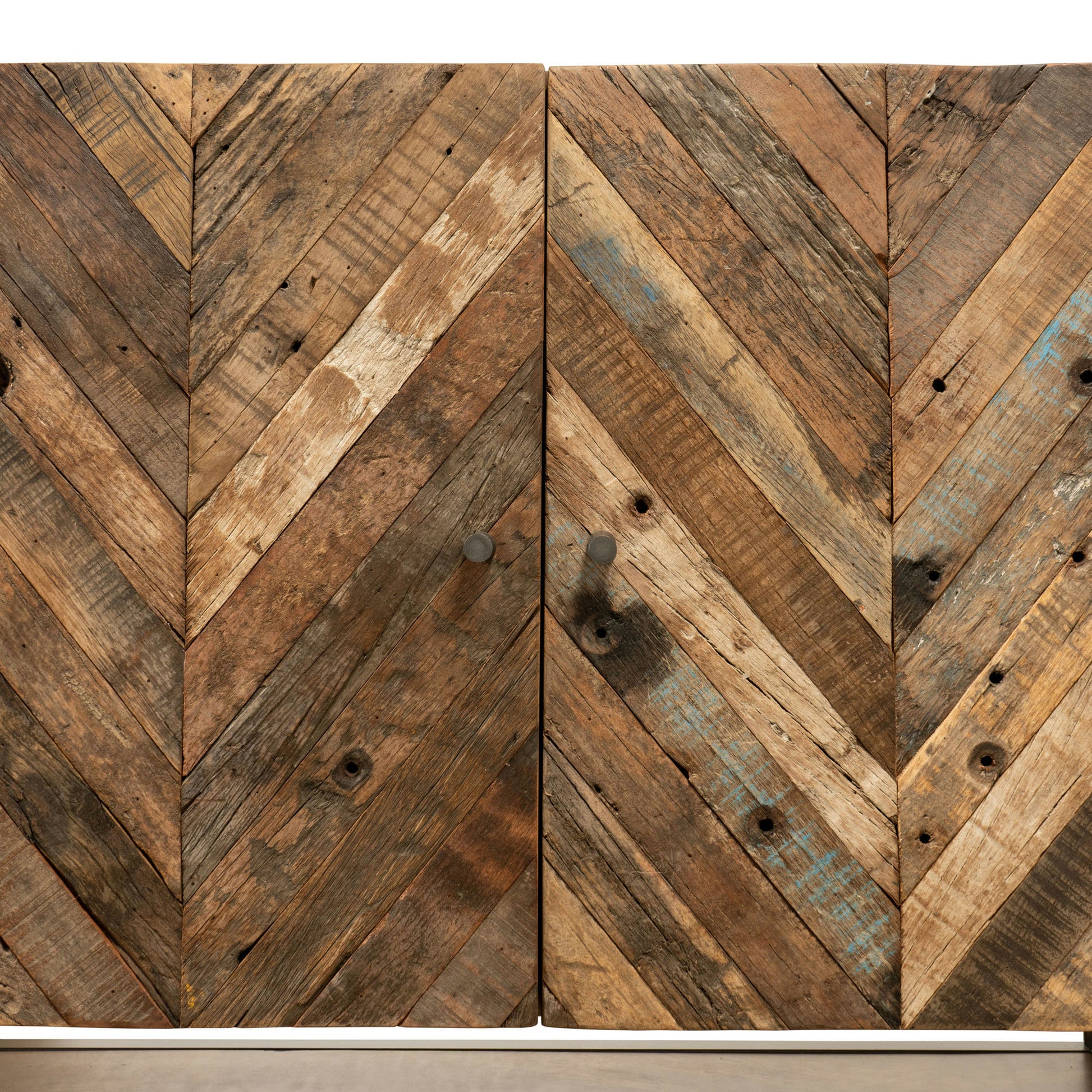 Revitalize your space with this rustic yet modern solid wood sideboard. Crafted from reclaimed wood, the doors display a herringbone pattern, iron detail edges and iron legs. This cabinet was designed with storage in mind and feature three doors and plenty of shelving. This unique piece is sure to upgrade your style make an impactful design statement