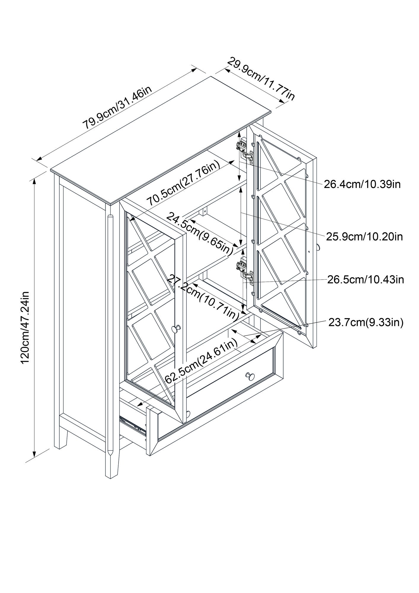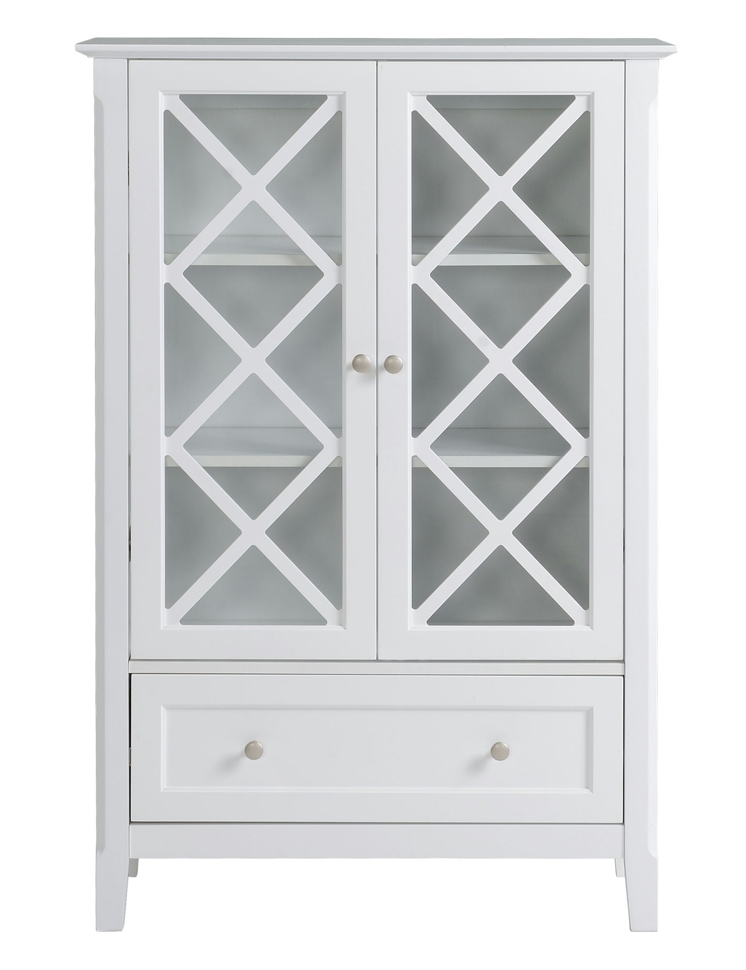 This elegant cabinet is sure to make a statement in any room. Adjustable shelves and lower drawer ensure plenty of storage. Cross pattern window panes give this cabinet an upscale look. Available in both white and light gray finish.