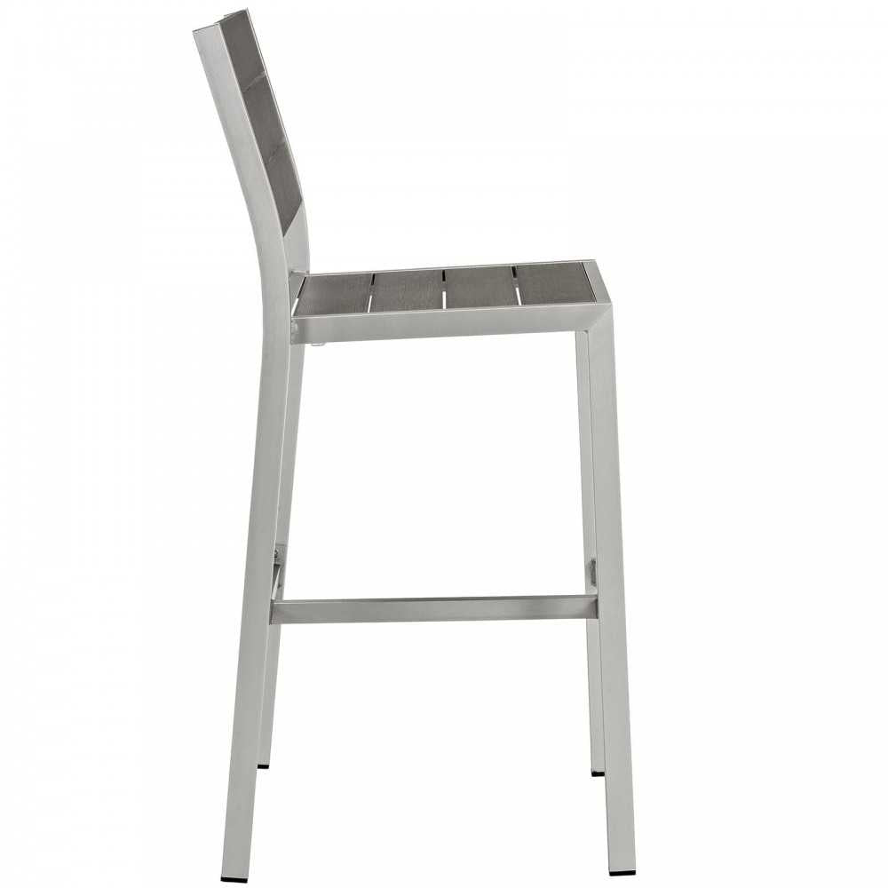 Enjoy your patio or backyard leisure time with the strong and durable Shore Outdoor Patio Armless Bar Stool. Made with an anodized brushed aluminum frame, sturdy footrest, and non-marking black plastic foot caps, Shore Patio Armless Bar Stool features tone-on-tone grays with wood accents on the paneling for a chic and minimalist look. The Shore Outdoor Bar Stool complements your casual gatherings with the versatility you"™ve been looking for in a patio bar stool.