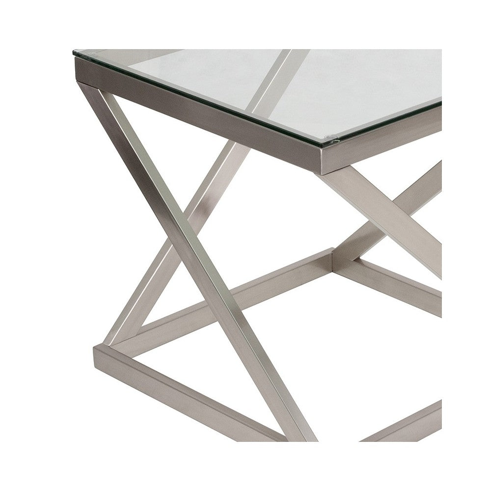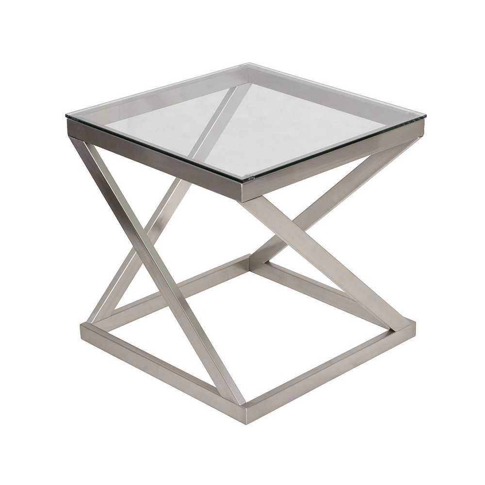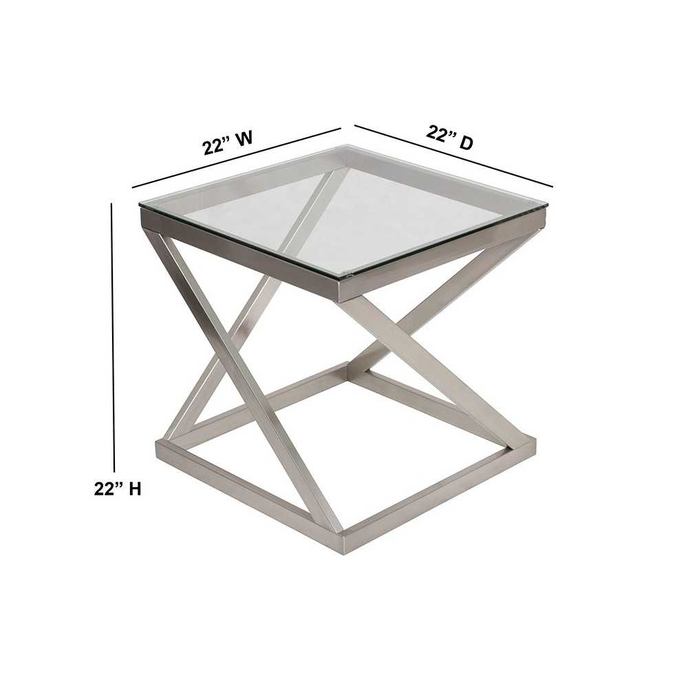Your quest for the ultimate end table has come to an end - that is if you lean toward contemporary. Decked out in a chic brushed nickel finish, the angled metal base is striking from every angle. This end table adds an exquisite touch of sophistication to your home. A brushed nickel colored finish tubular metal frame supports the tapered beveled glass top of this end table adding a sleek, metro-modern design to your living room space. Featuring an open, airy look and space-saving construction, this square table fits well even in small spaces. [FSD-TE-36BNK-GG]