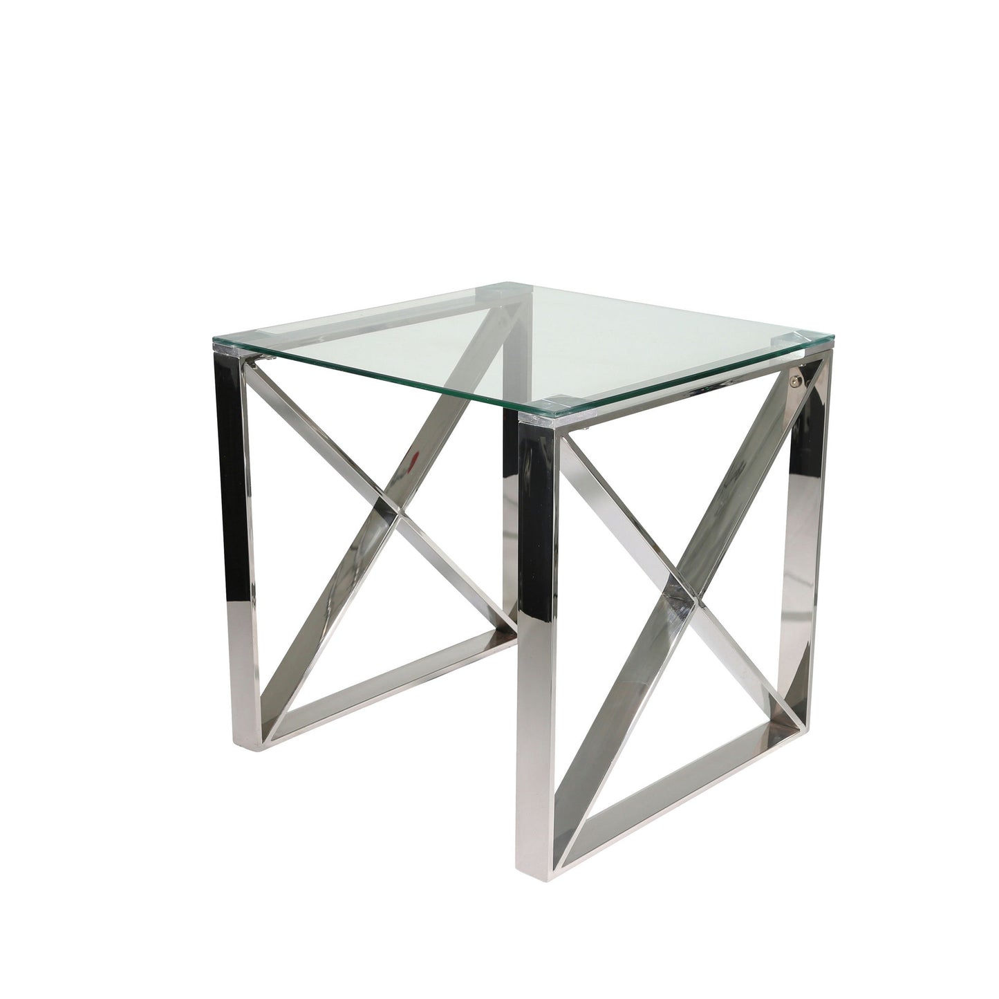 Modern, classy and simple, this silver side table from sage Brook decor is a contemporary addition for your living space to upscale the whole decor idea. Made up in a strong framework in stainless steel with geometric "X" designs on its stand, the table top is in clear sturdy beveled glass to give you a real party feel.