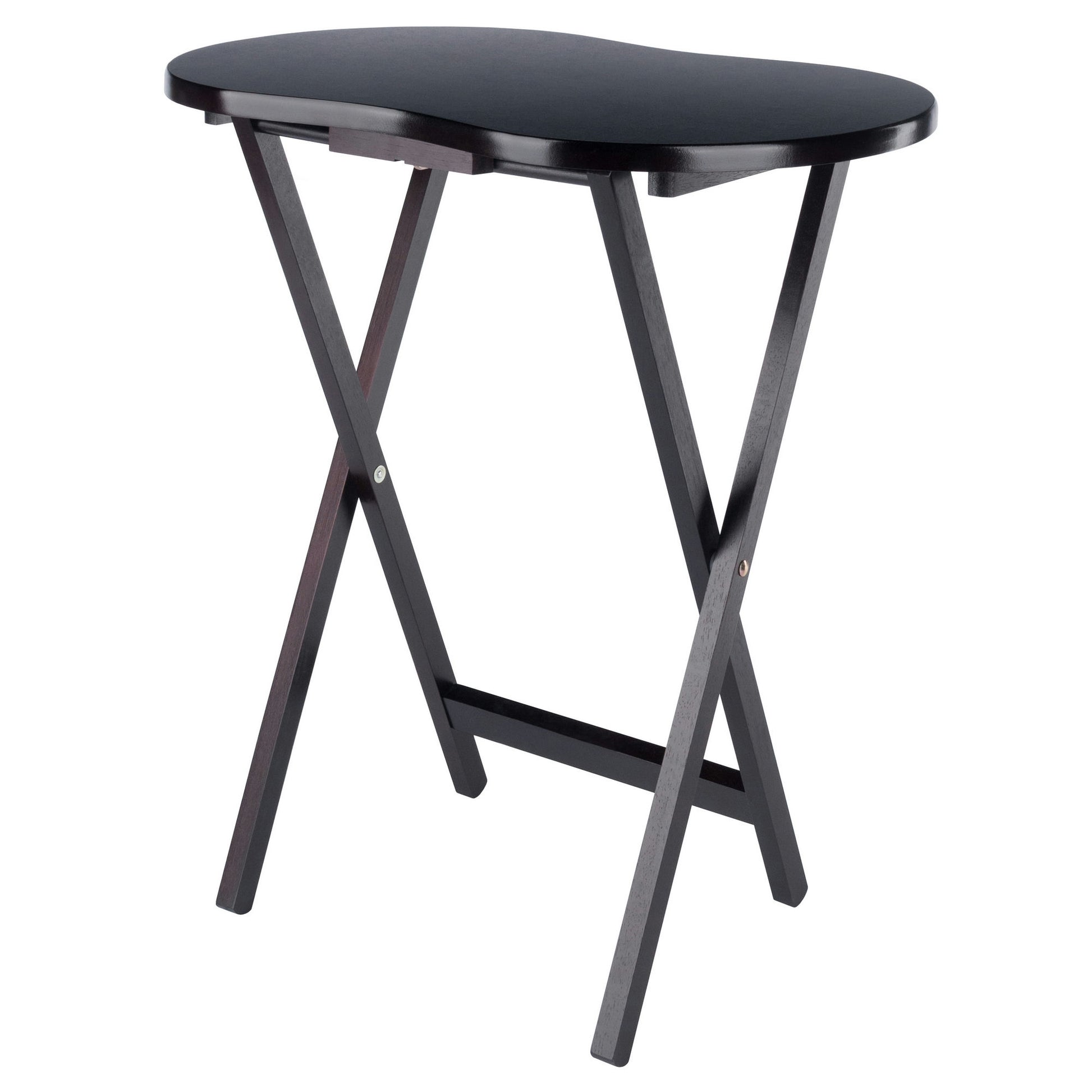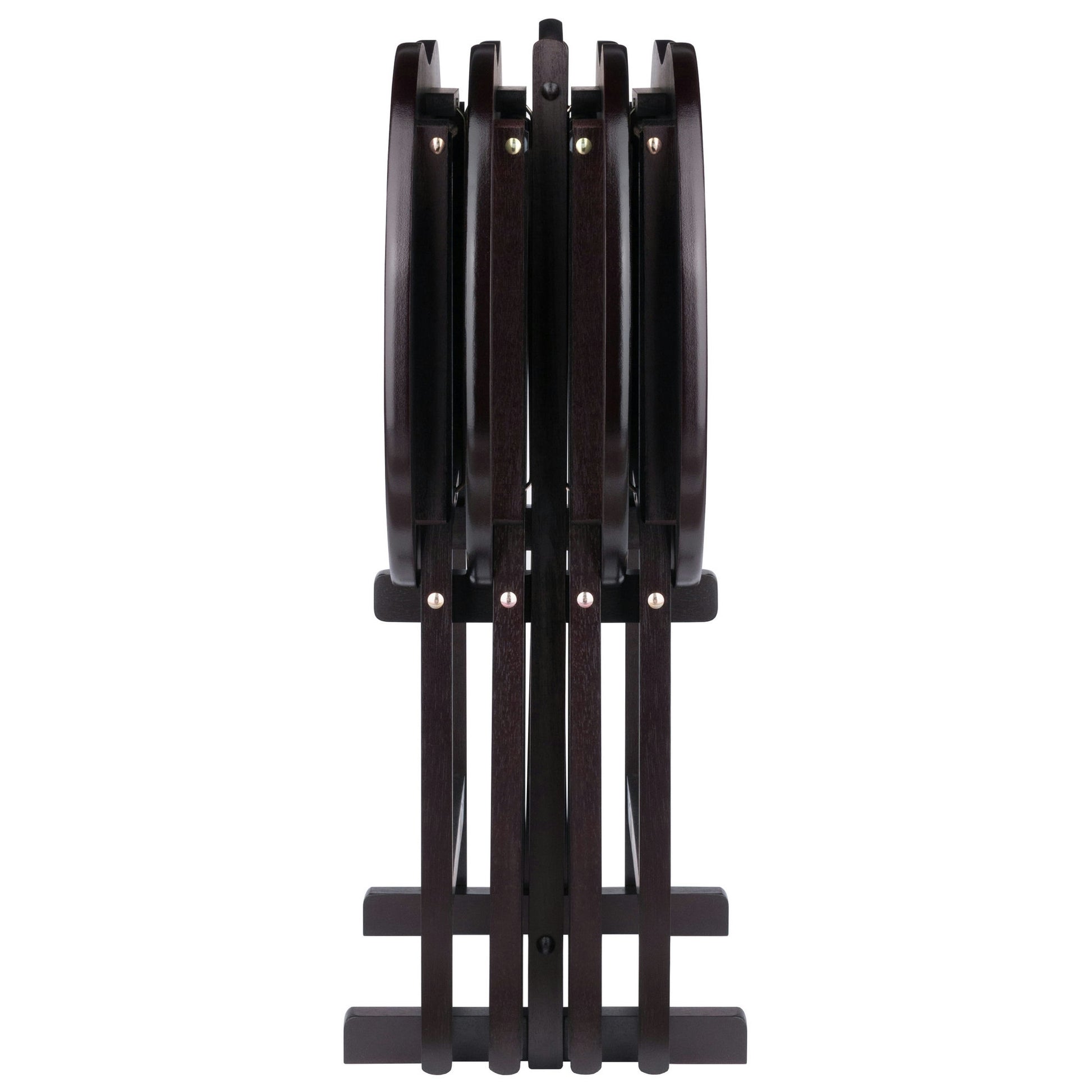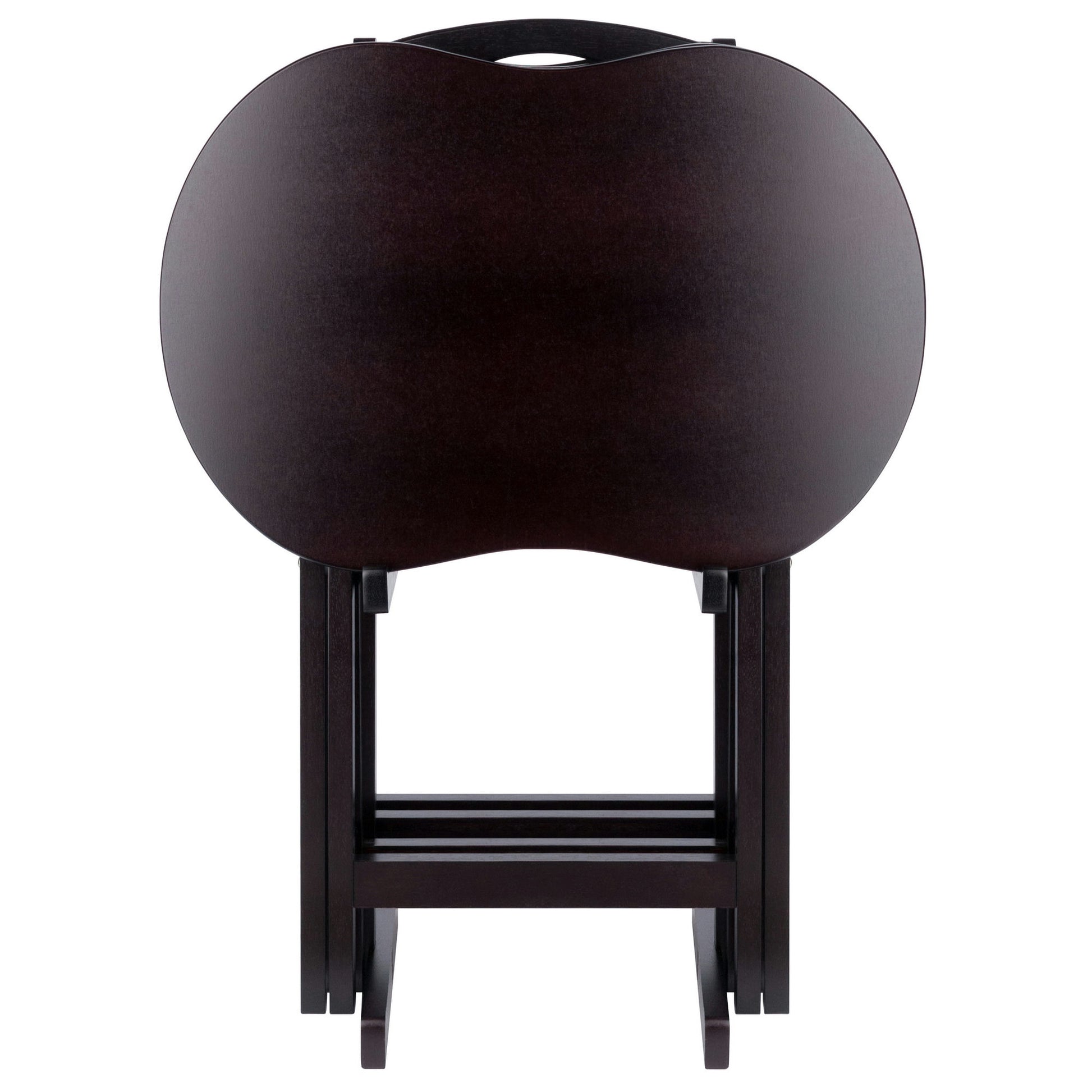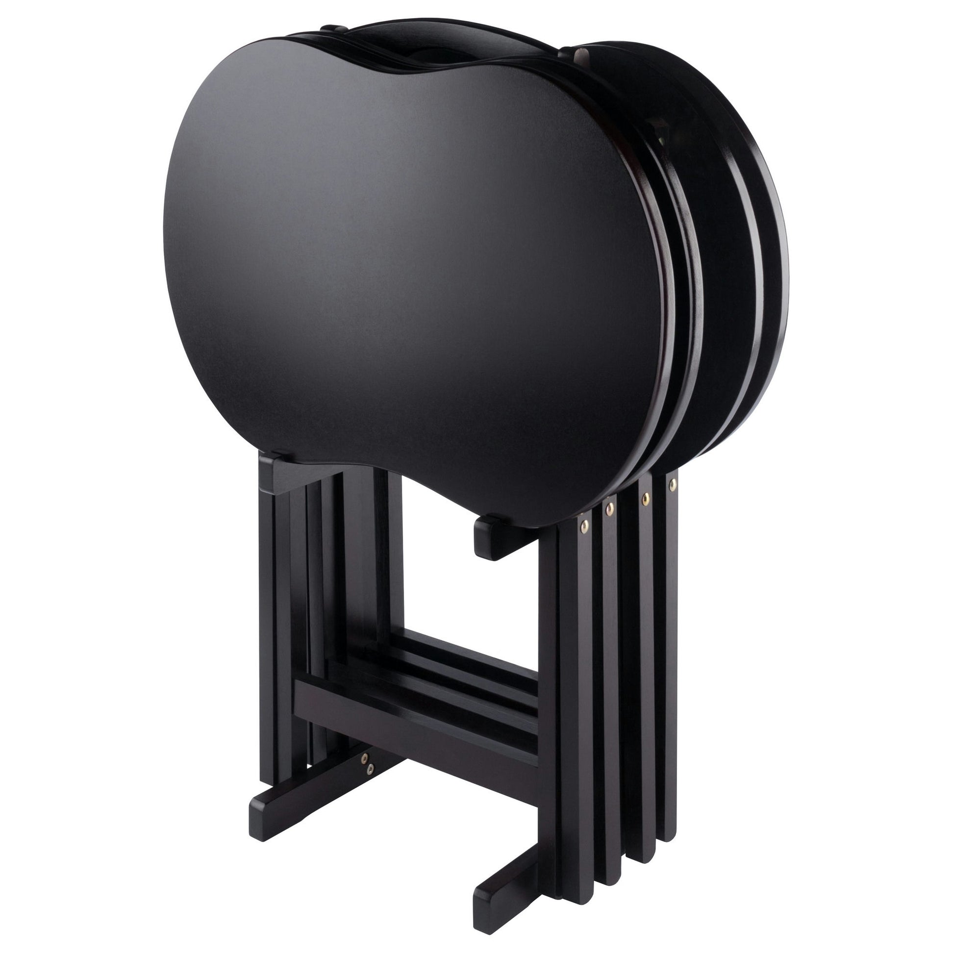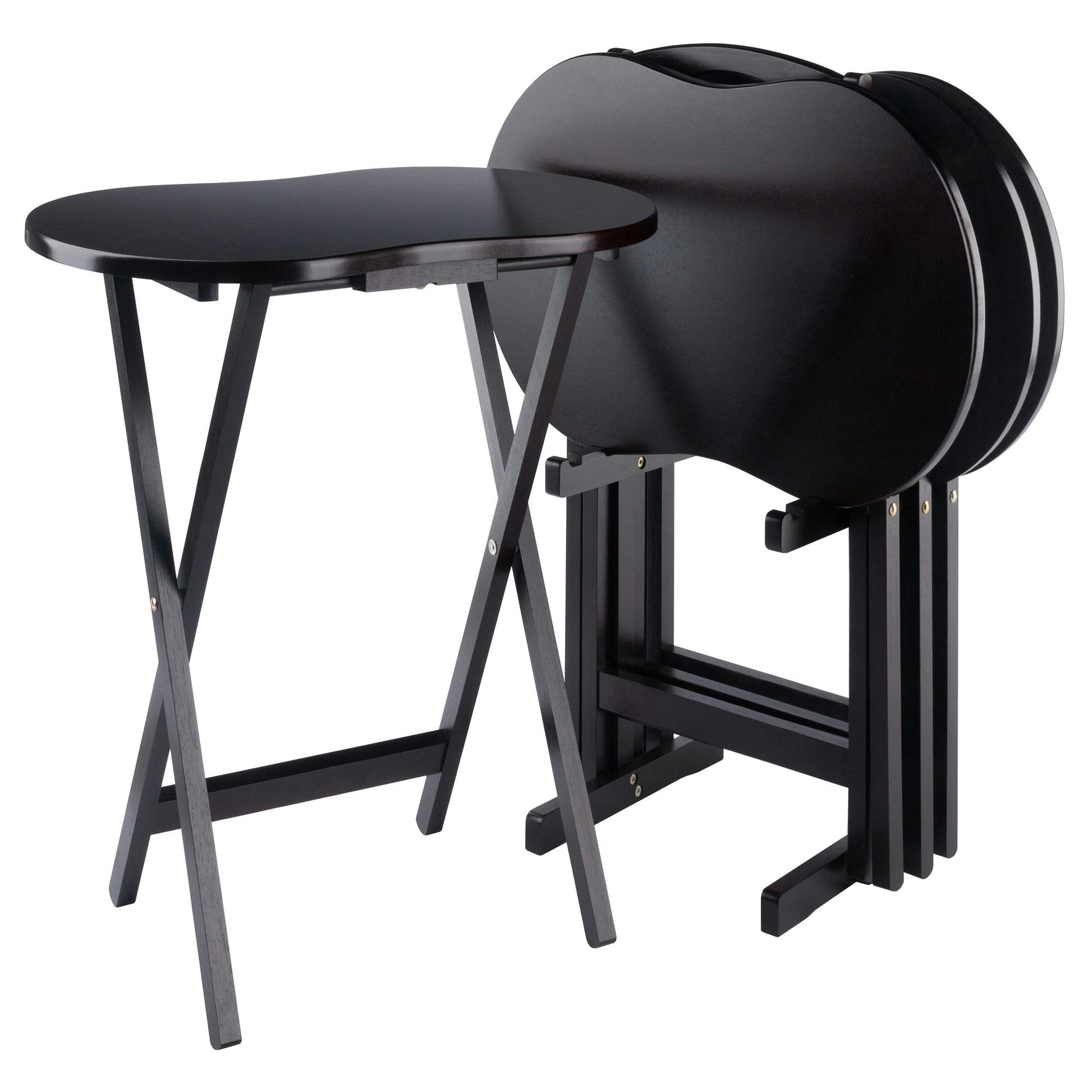 Great for keeping in dining room, kitchen or game room, the 5-Pc TV Table is great to have for work and play time. With "Peanut" tops, these wood TV Tables can easily hold a large meal with style. An upright stand stores them when not in use.