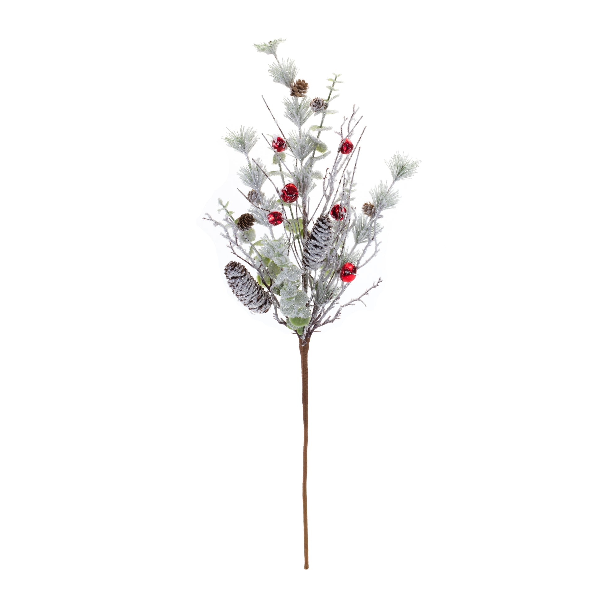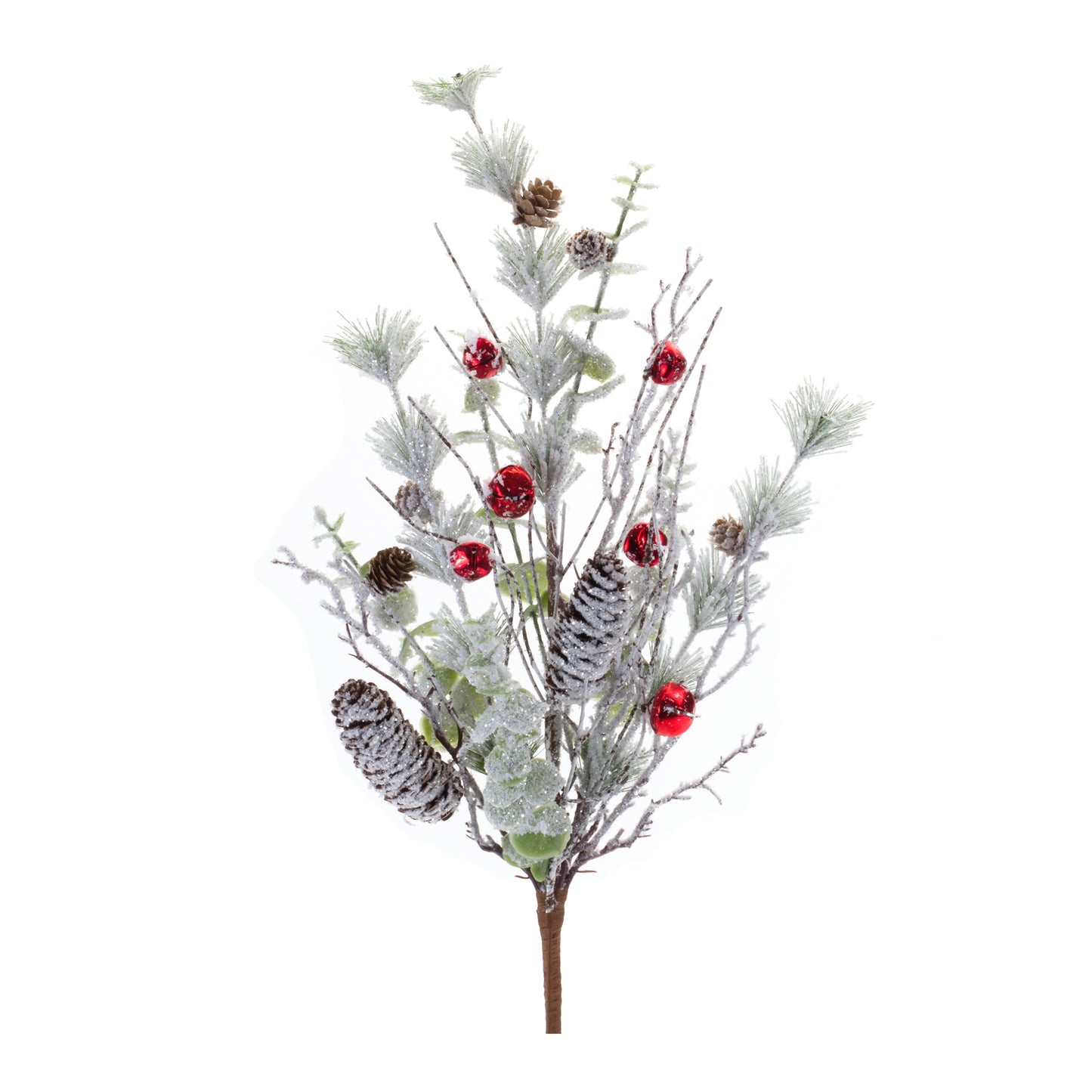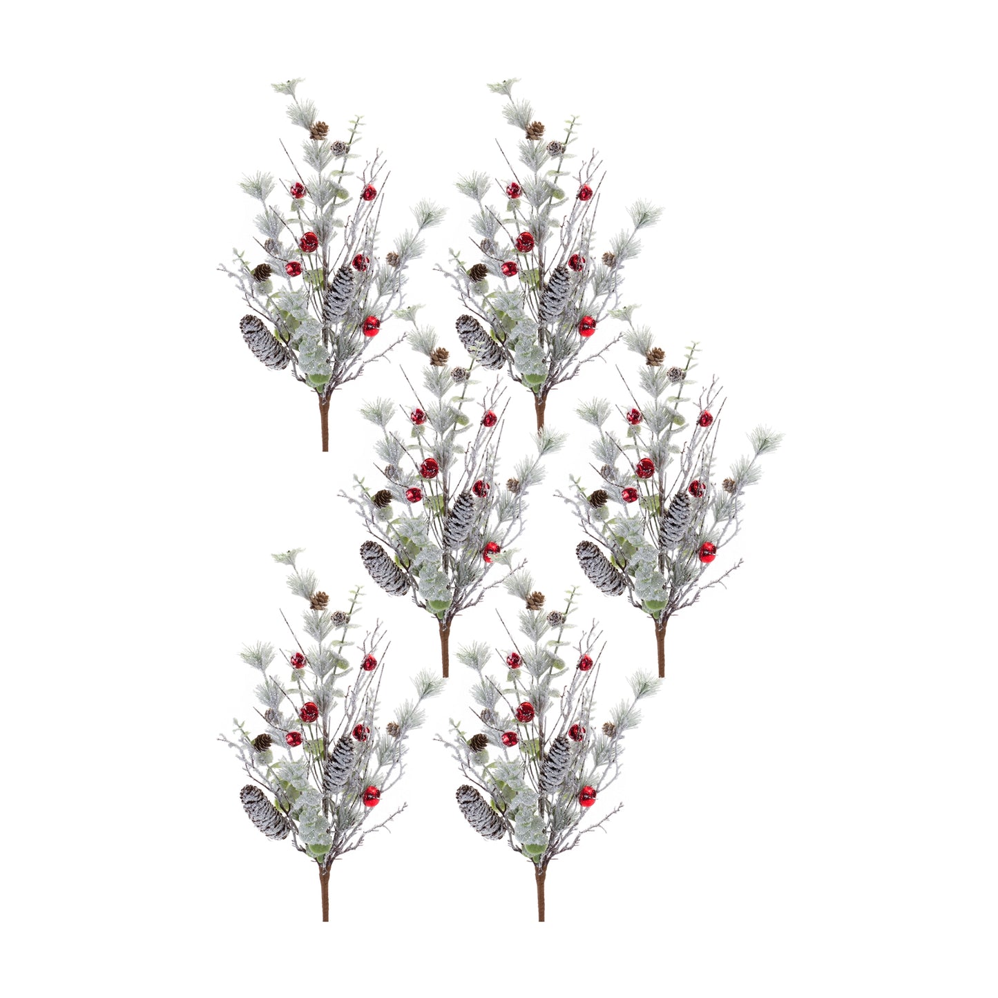 Ring in the holiday season with this beautiful set of Snowy Pine Sprays with Sleigh Bells. Featuring six pieces, this set would be a great addition to your Christmas centerpiece or table arrangement. The varigated pine foliage paired with the pinecone and sleigh bell accents and "snowy" finish is the perfect combination to create a stunning Christmas display. Add this set to a table vase to make a statement.