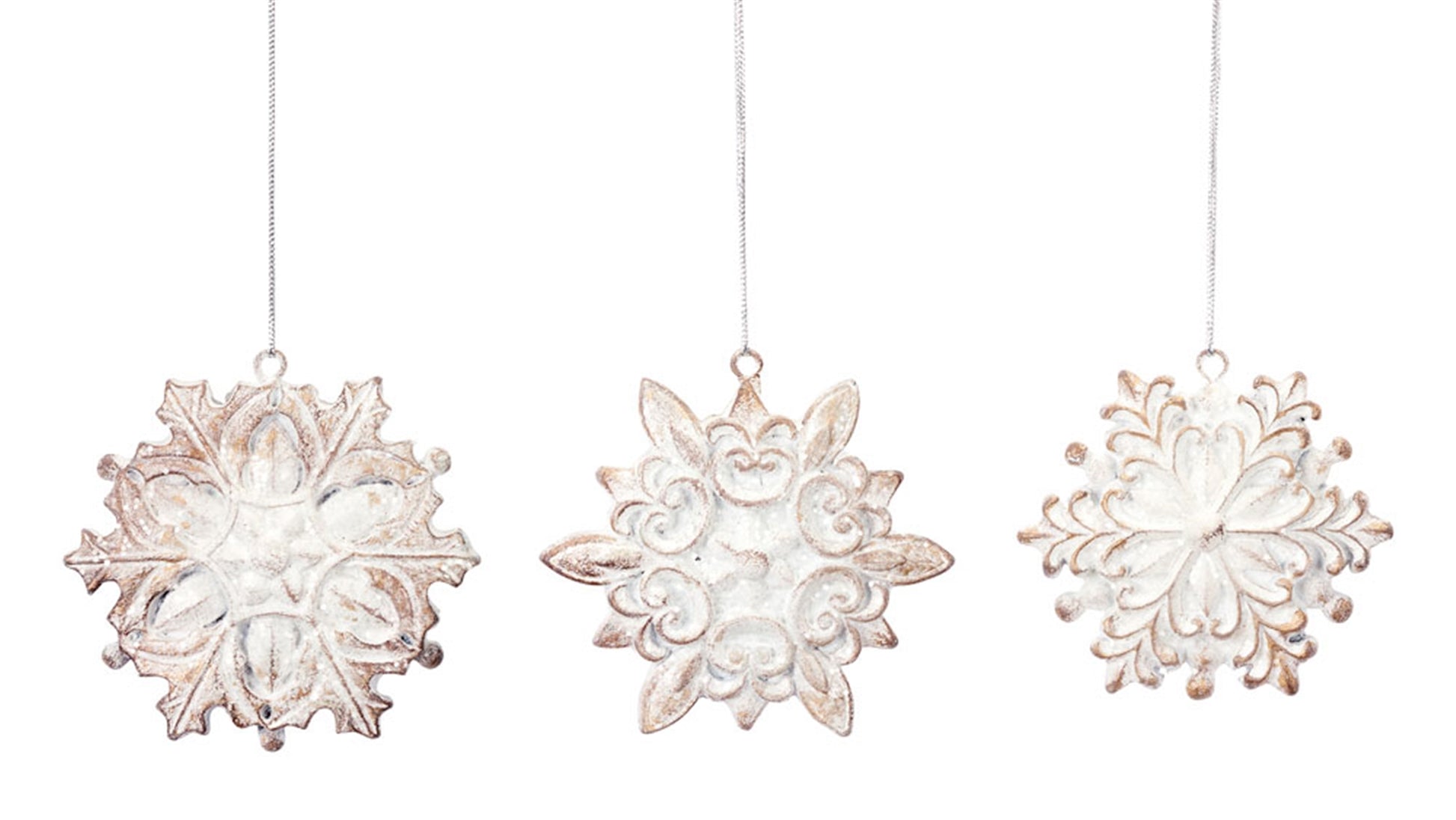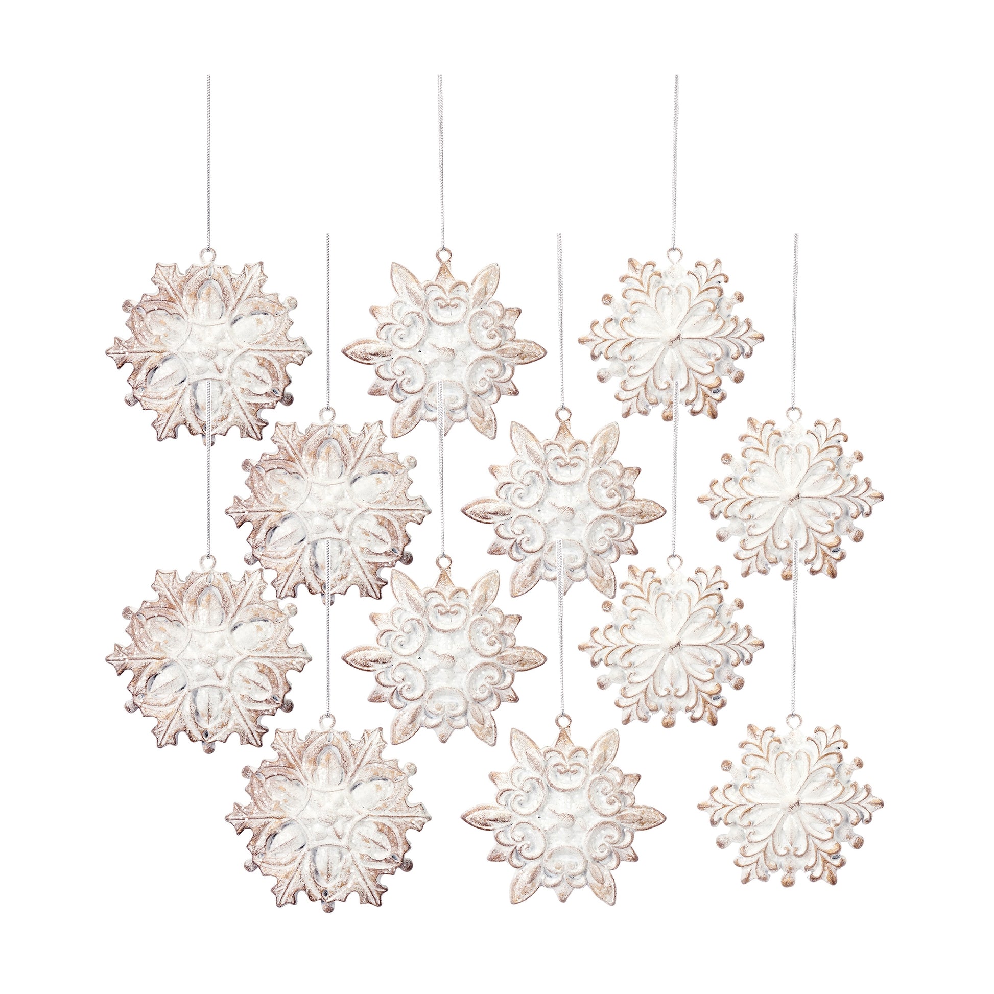 Adorn your Christmas Tree with this beautiful set of Jewel Snowflake Ornaments. Featuring three assorted designs and twelve total pieces, the traditional snowflake design paired with the moder white-washed finish makes this piece the perfect addition to your holiday tree decor. They can be used as Christmas gifts for friends to cherish, or you can display the set on your own tree and enjoy them for years to come.