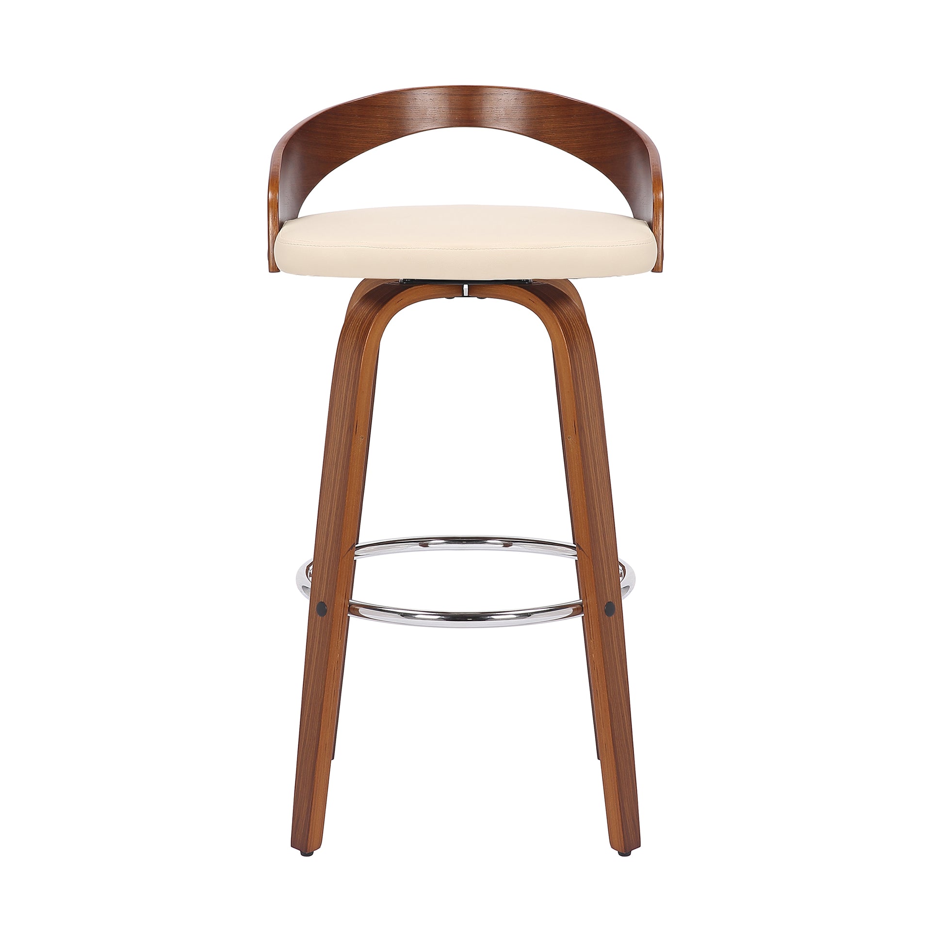 Add a touch of mid-century modern magic to your home with the Armen Living Sonia 30" Swivel Cream Faux Leather and Walnut Wood Bar Stool. Designed with comfort and style in mind, the Sonia features a 360-degree swivel that allows you to easily interact with your friends and family regardless of their place in the room! The curved wood low back is ideal for posture alignment and an unmatched support, its opening is perfect for breathable easy seating. The Sonia features a high-density foam cushion and beautiful faux leather upholstery that will allow you to sit or entertain for hours on end. The foundation of the product is supported by wood and chrome footrest for a chic and stylish aesthetic without comprising practicality and functionality of this item. The Sonia Swivel Faux Leather and Wood Bar & Counter Stool is available in a Walnut Finish with Brown, Grey, or Cream faux leather upholstery or Black Wood with Grey faux leather upholstery and a 26” or 30” seat height.