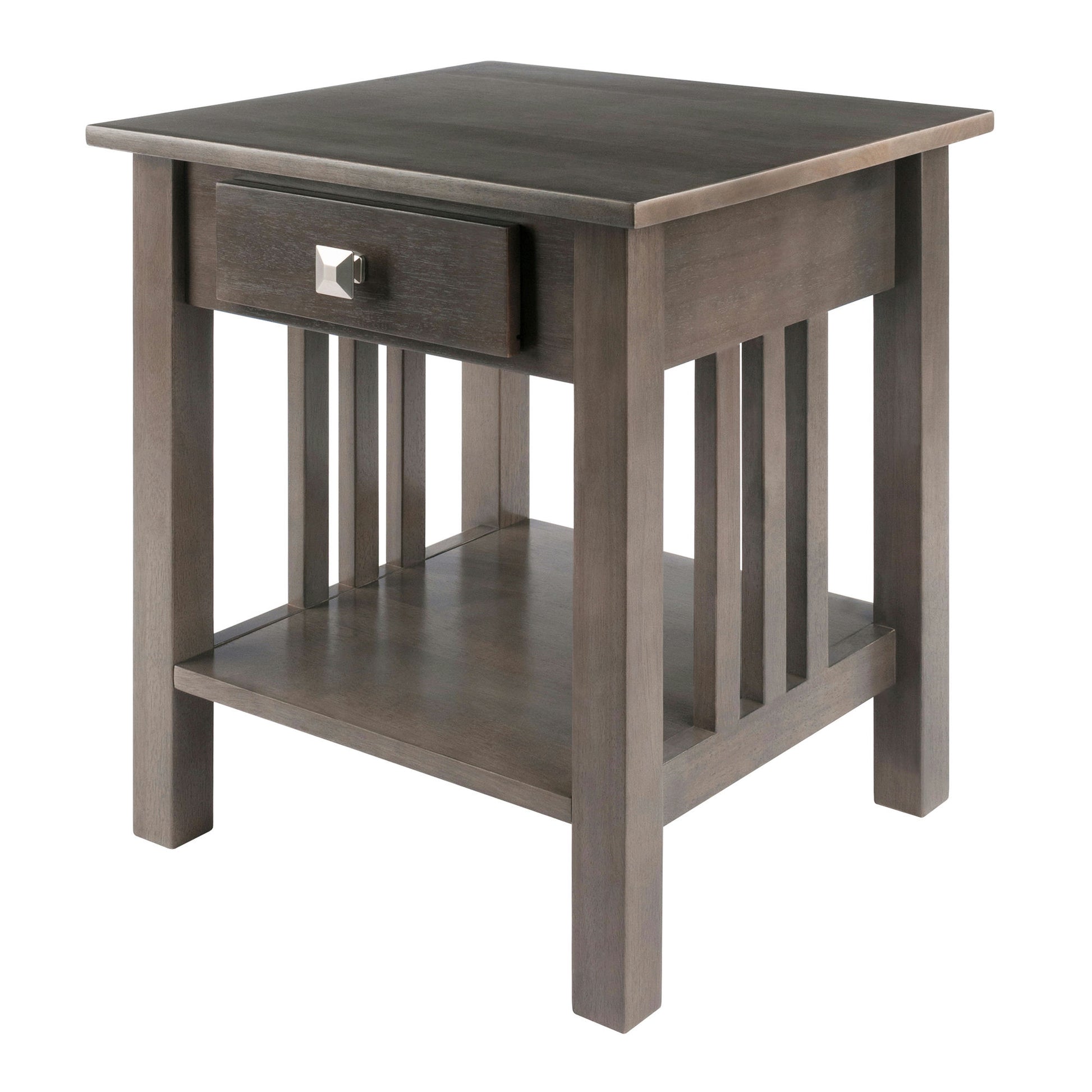 The Stafford End Table is a lovely fusion of classic design and contemporary Oyster Gray finish. A drawer and open shelf offer storage options as a bedside table or in the living room next to the sofa. Solid Wood construction for long-lasting integrity.
