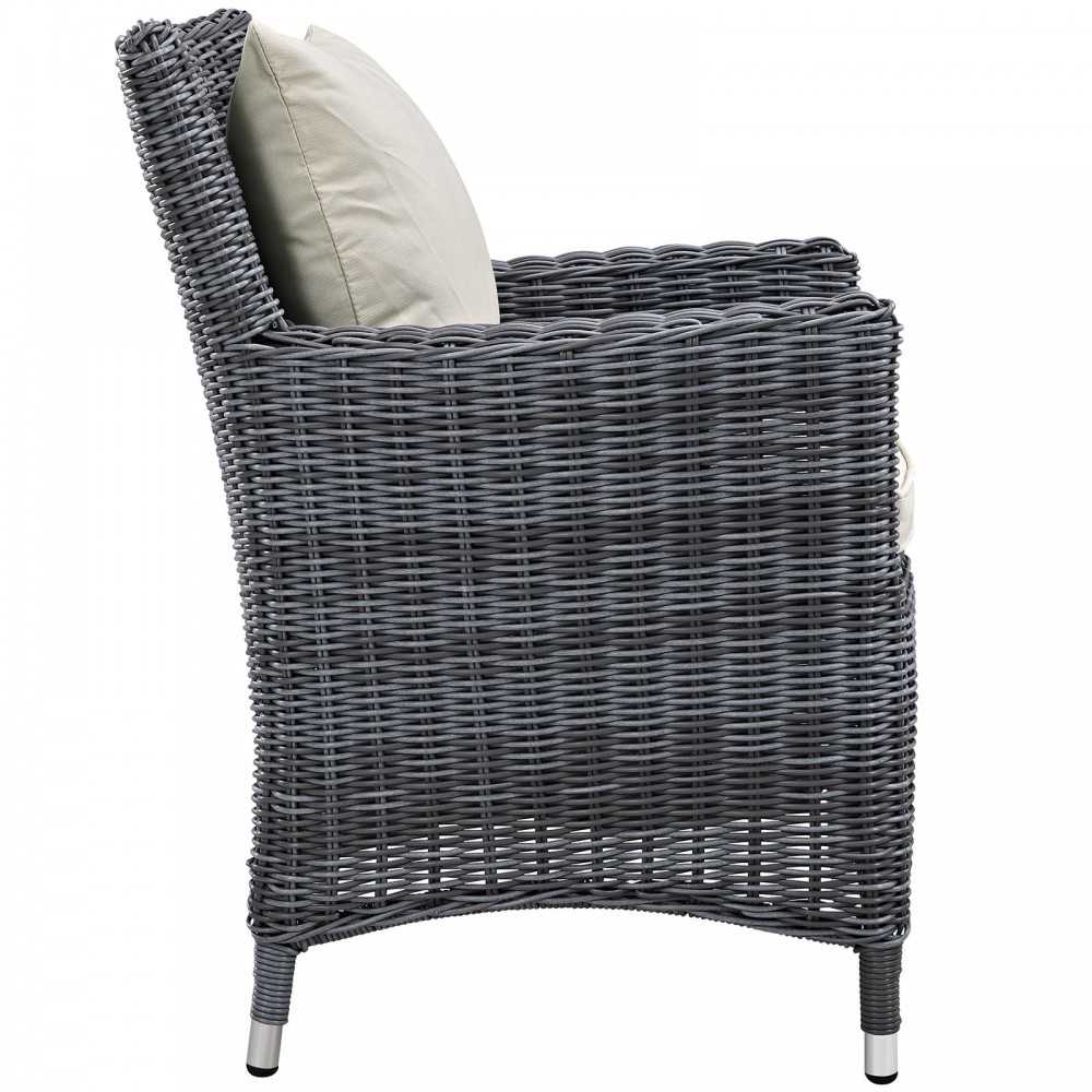Experience the outdoors with exceptional comfort and quality. Summon Outdoor Patio Dining Table Set offers an exquisite two-tone synthetic rattan weave, plush all-weather cushions with industry-leading Sunbrella fabric, UV protection, and a sturdy powder-coated aluminum frame. Featuring rounded arms and an elegant modern look, Summon Outdoor Dining Furniture set is part of an avant-garde outdoor sectional series well-equipped for enhancing patio, backyard, or poolside gatherings. This installment of the series is an Outdoor Patio Dining Table and Armchair Set.