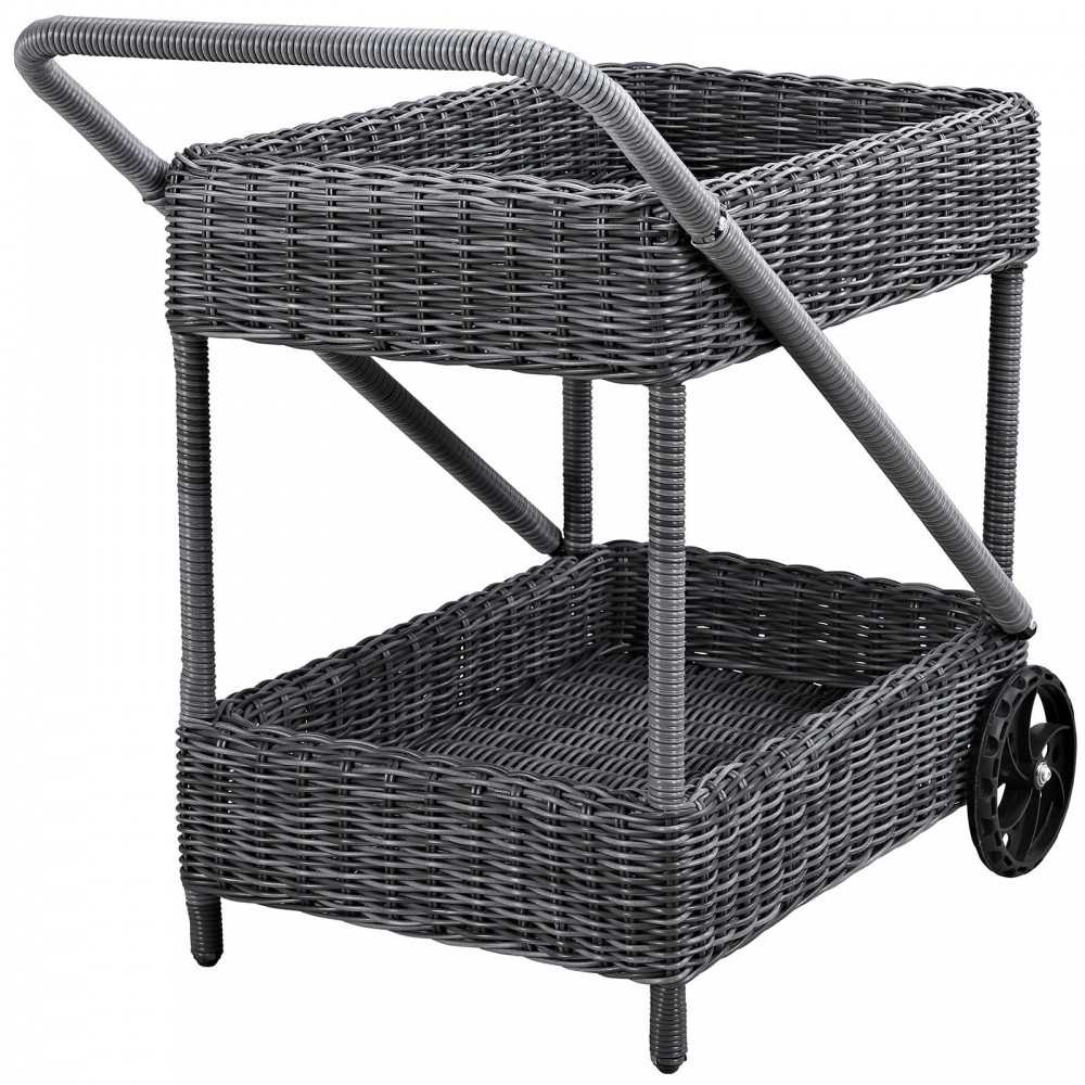 Experience the outdoors with exceptional comfort and quality. Summon Outdoor Patio Bar Cart offers an exquisite two-tone synthetic rattan weave, plush all-weather cushions with industry-leading Sunbrella fabric, UV protection, and a sturdy powder-coated aluminum frame. Featuring an elegant modern look, Summon Patio Bar and Beverage Cart is part of an avant-garde outdoor sectional series well-equipped for enhancing patio, backyard, or poolside gatherings. This installment of the series is an Outdoor Patio Beverage Cart.